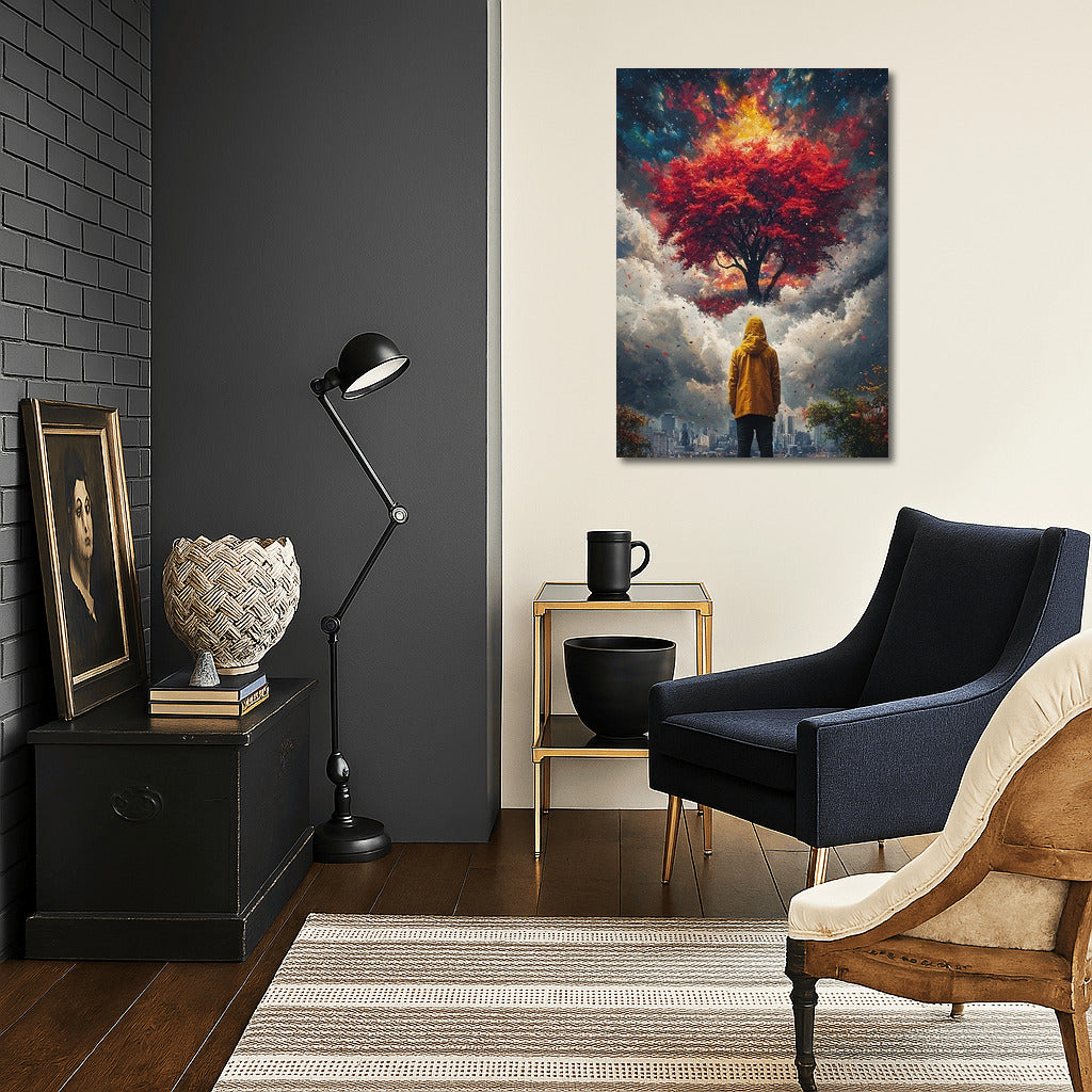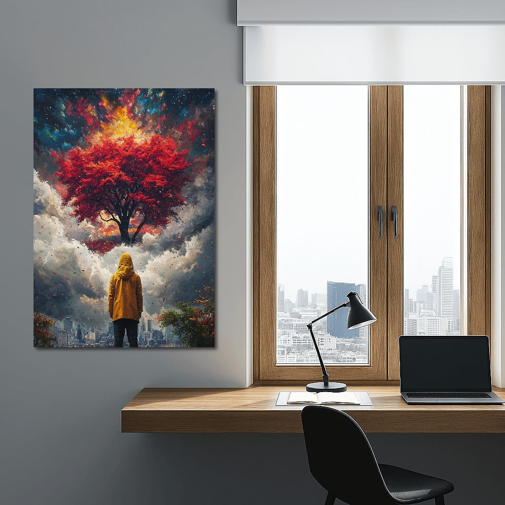 Poster: A mysterious figure in a yellow cloak looks at a fiery tree floating above the clouds and the city. Dream wall art. See more from the collection: Mixed Wall Art