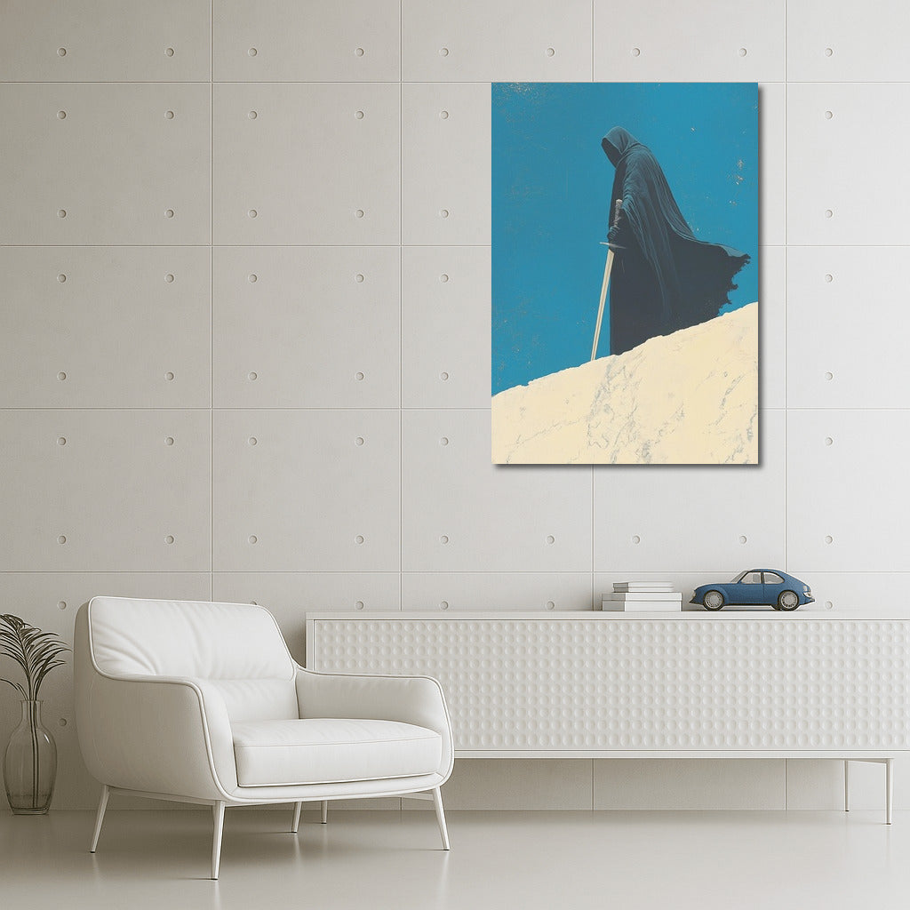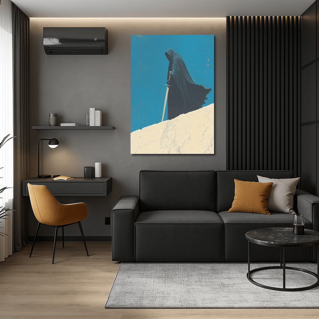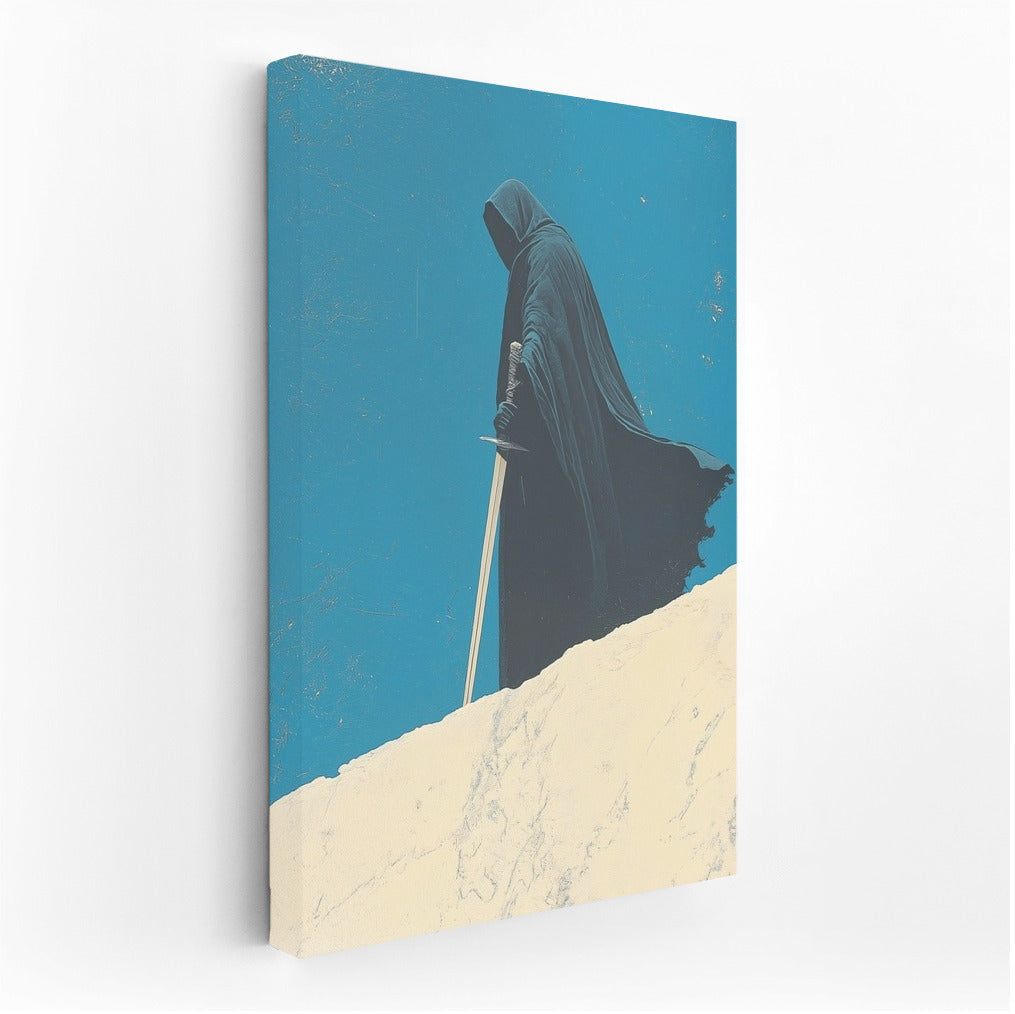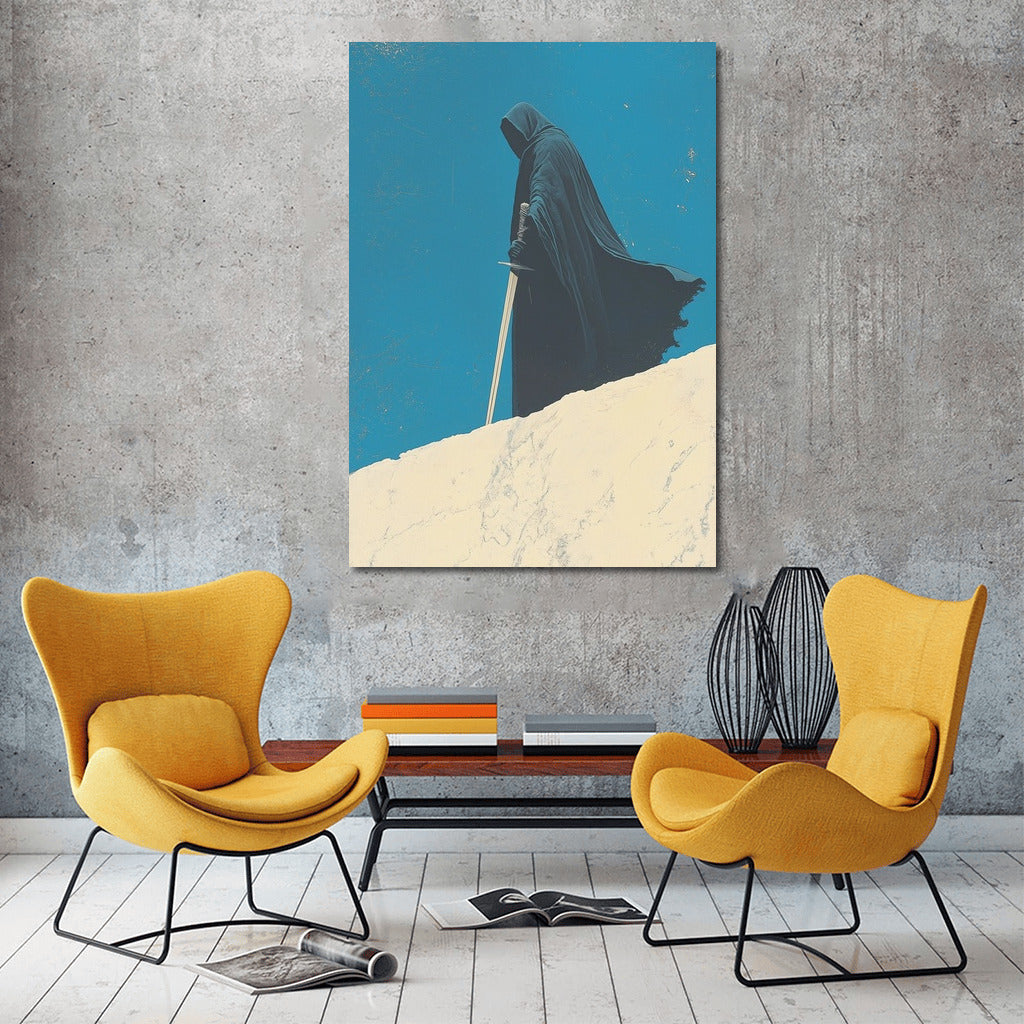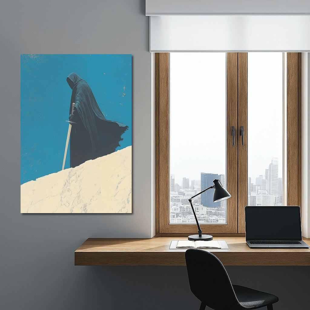 Mystery in the Hood: The poster immerses in an atmosphere of mystery and power. Wall art where the sword and figure merge with the sky. See more from the collection: Mixed Wall Art