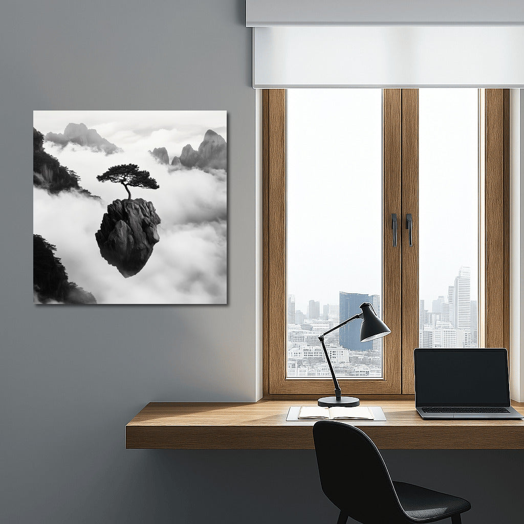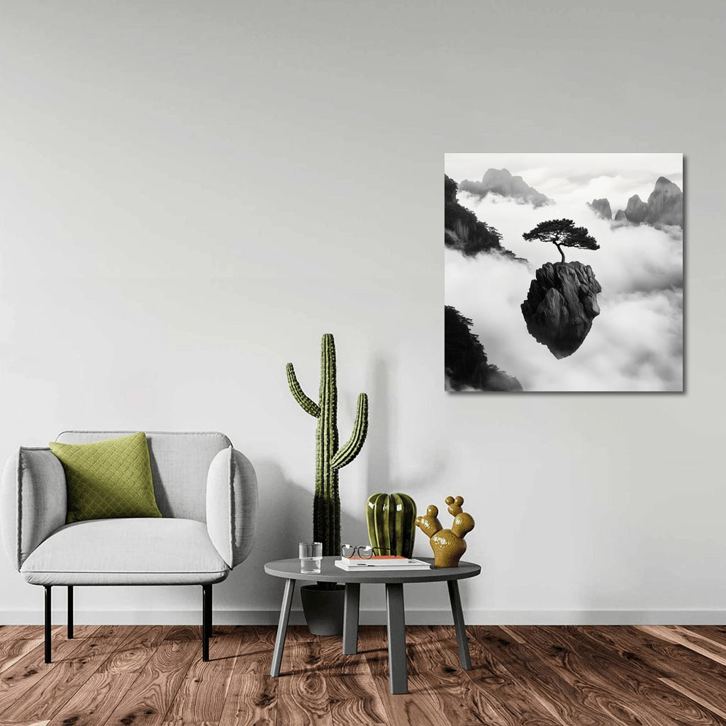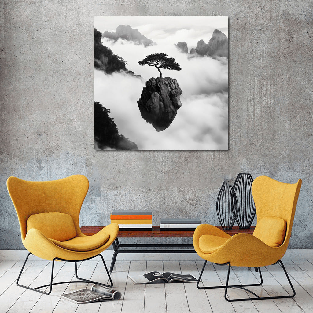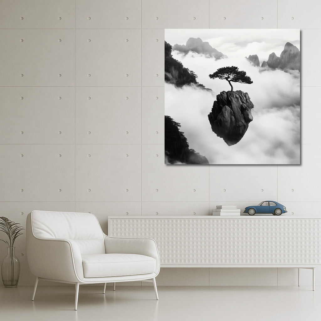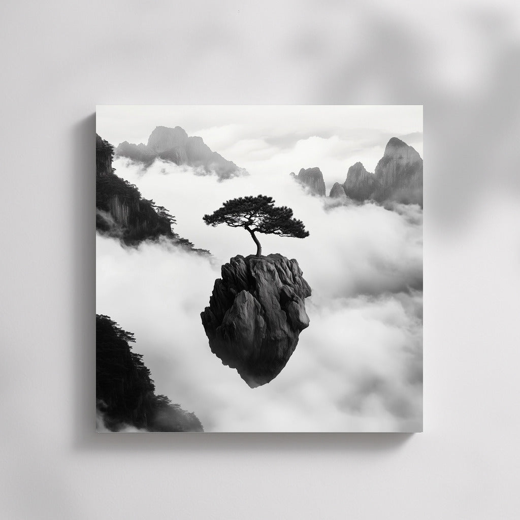 Monochrome painting: a lonely tree on a rock in a foggy abyss. A poster that inspires and mysteriously decorates your interior. See more from the collection: Black and White Art