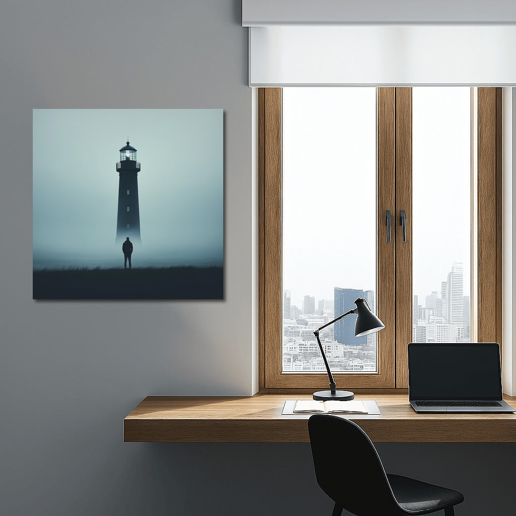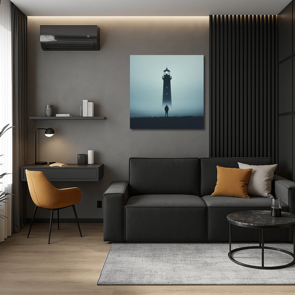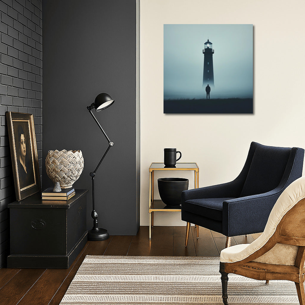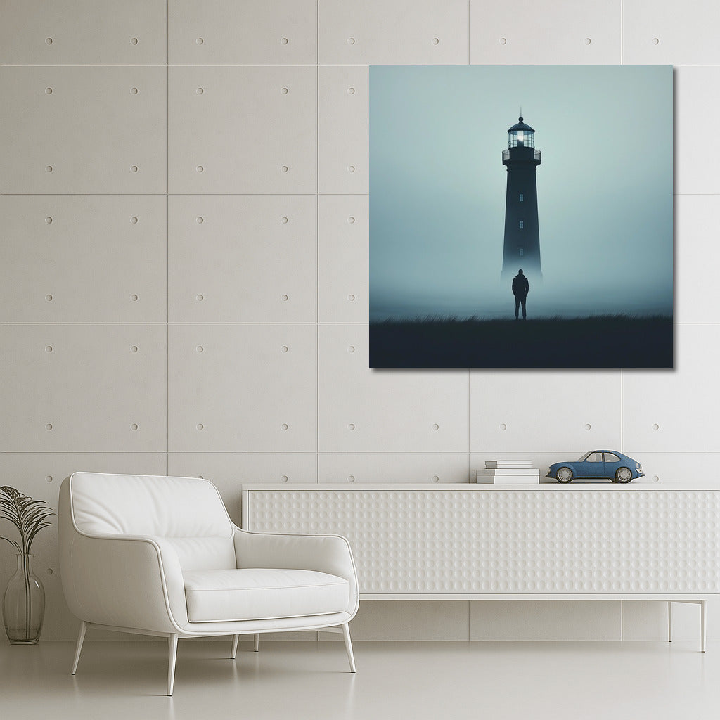 A majestic lighthouse in the darkness and a lone figure in the background. A poster that represents mystery and tranquility in wall art. See more from the collection: Mixed Wall Art