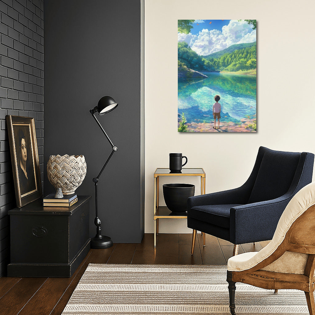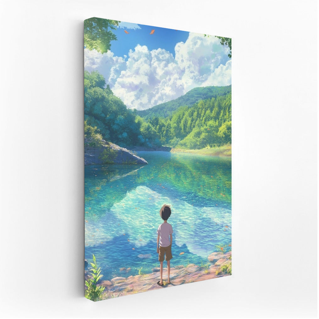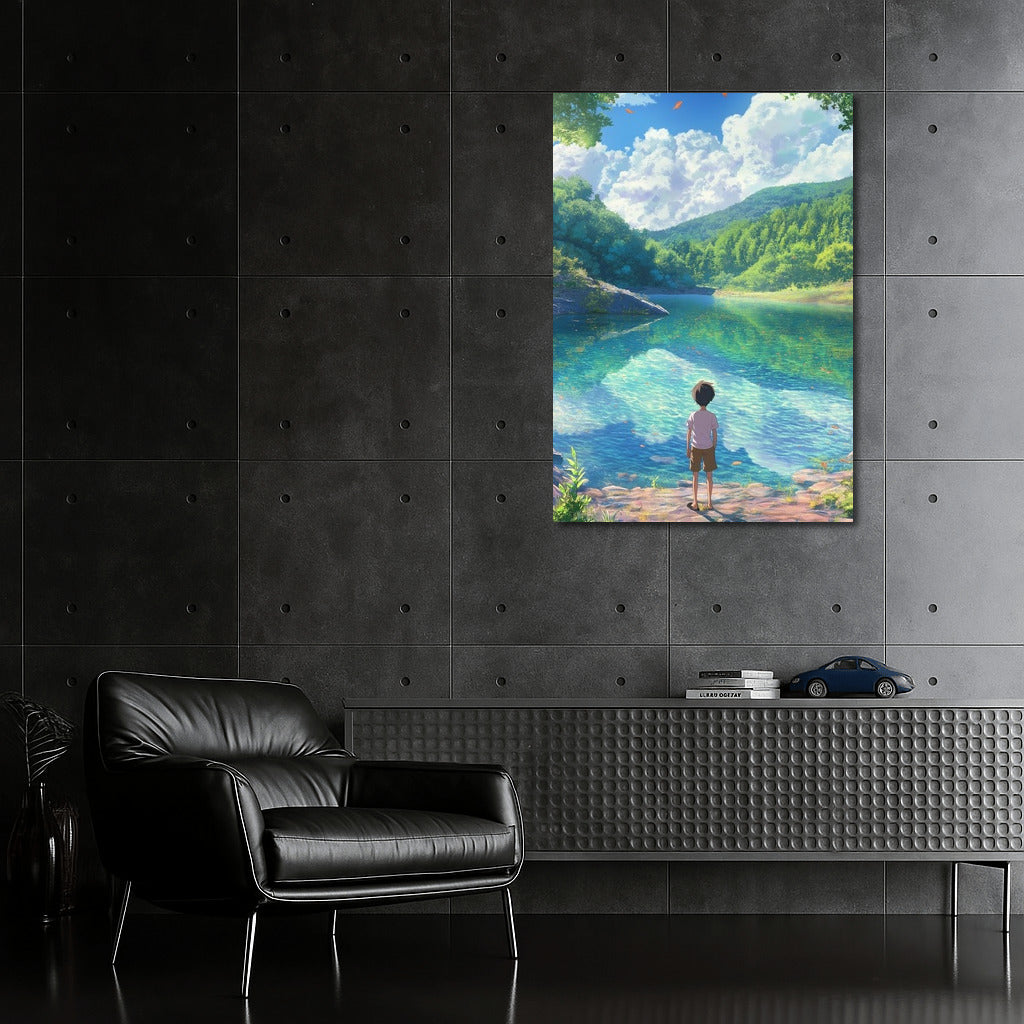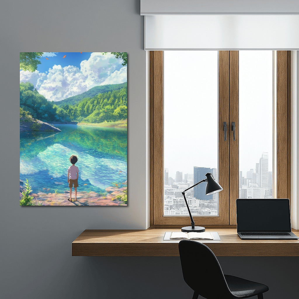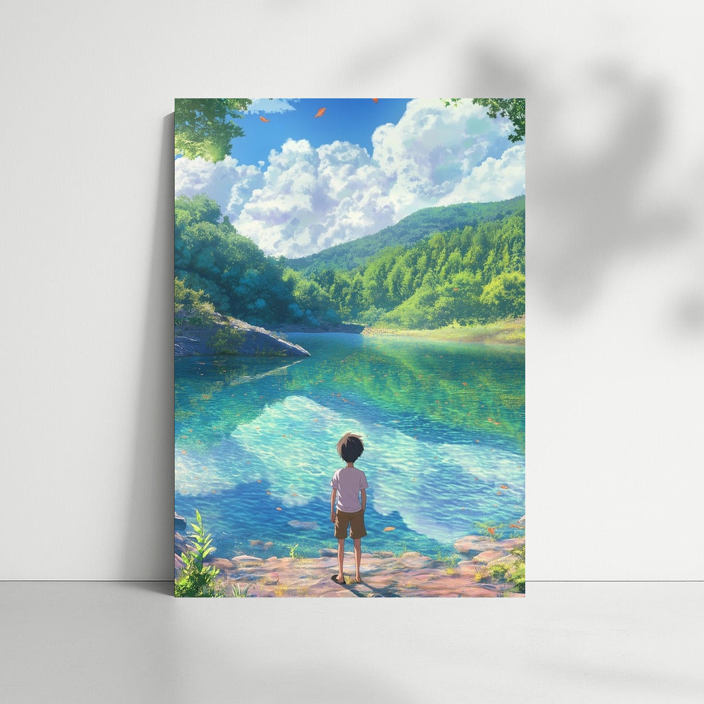 Dive into a dream world with this poster: a serene landscape and a mysterious character by the water. Nature-inspired wall art. See more from the collection: Anime & Manga genres Art