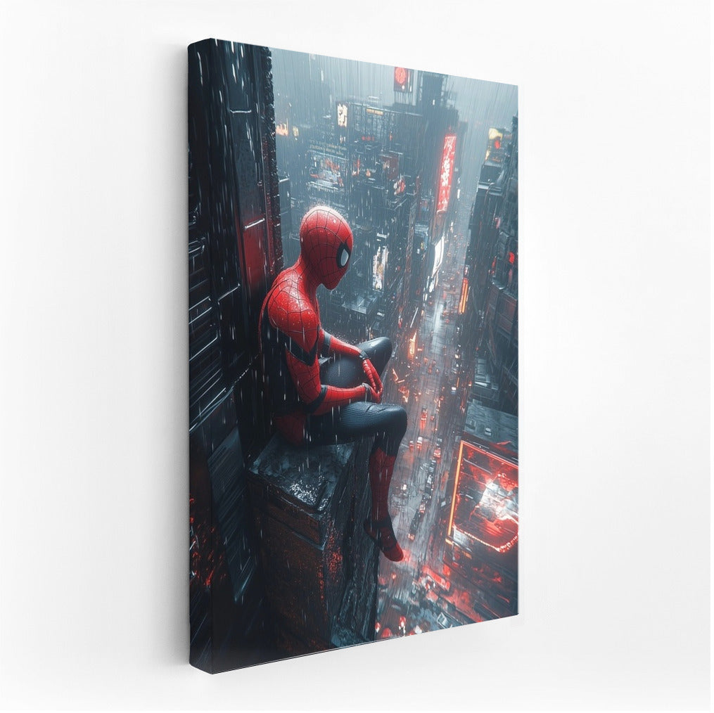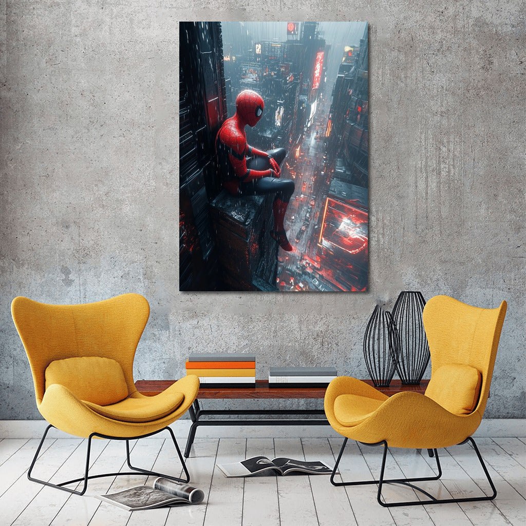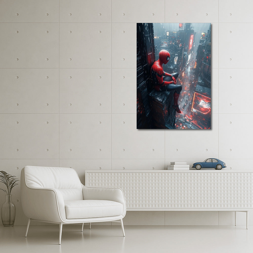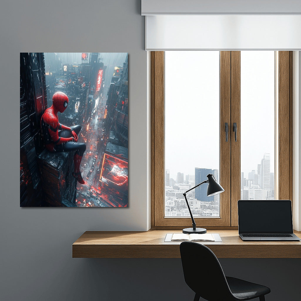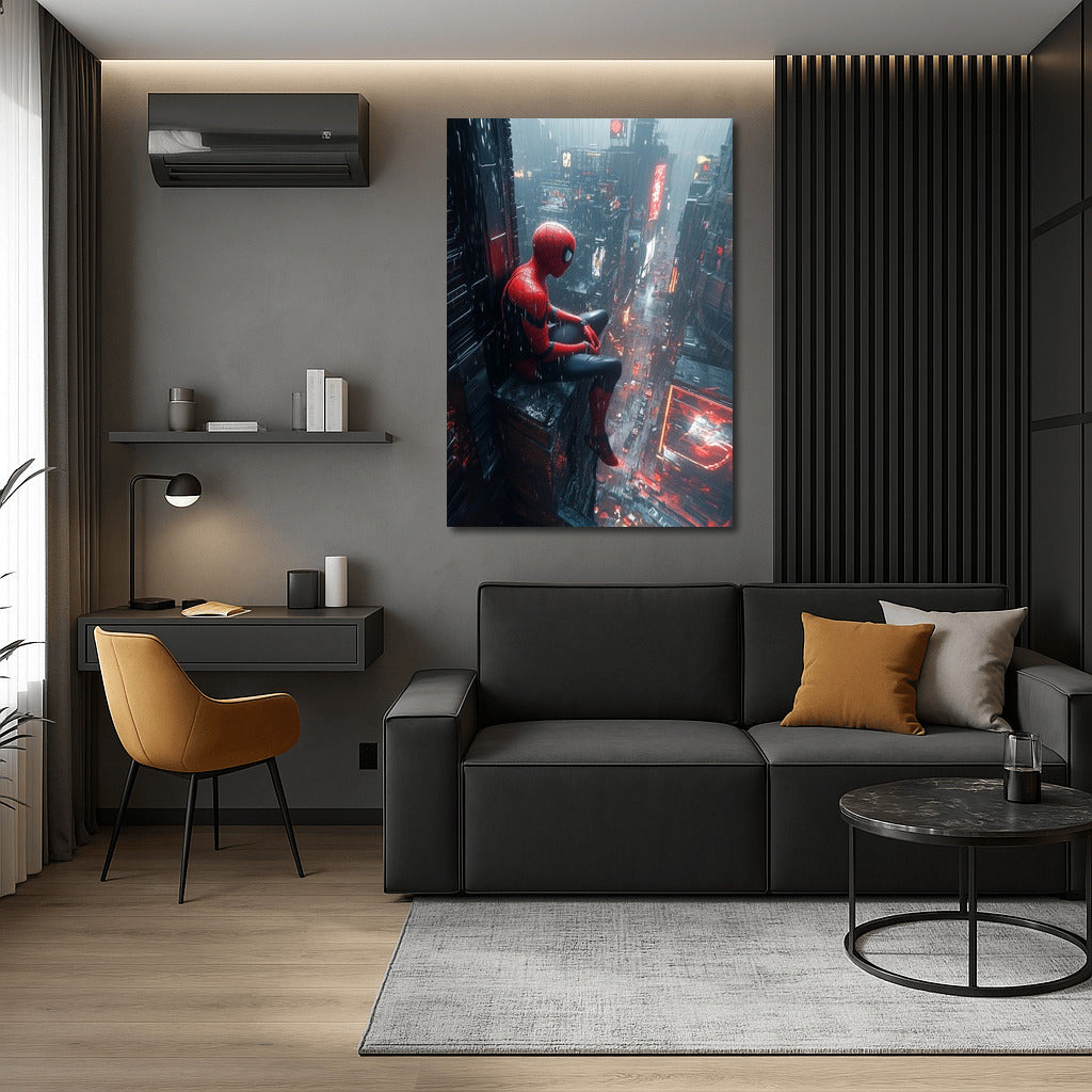 Superhero watches over rainy metropolis. Dynamic wall art for true fans of comics and urban atmosphere! See more from the collection: Mixed Wall Art