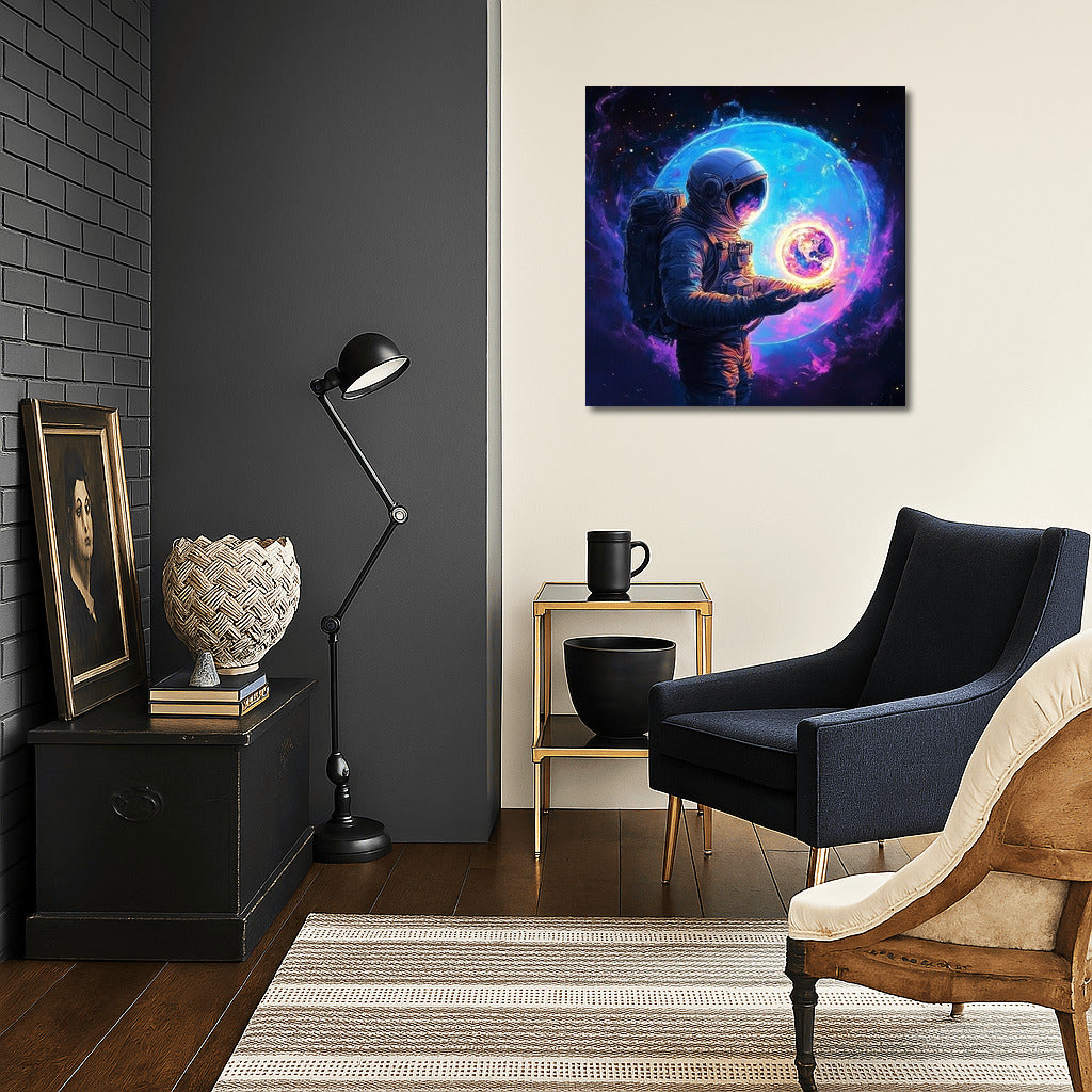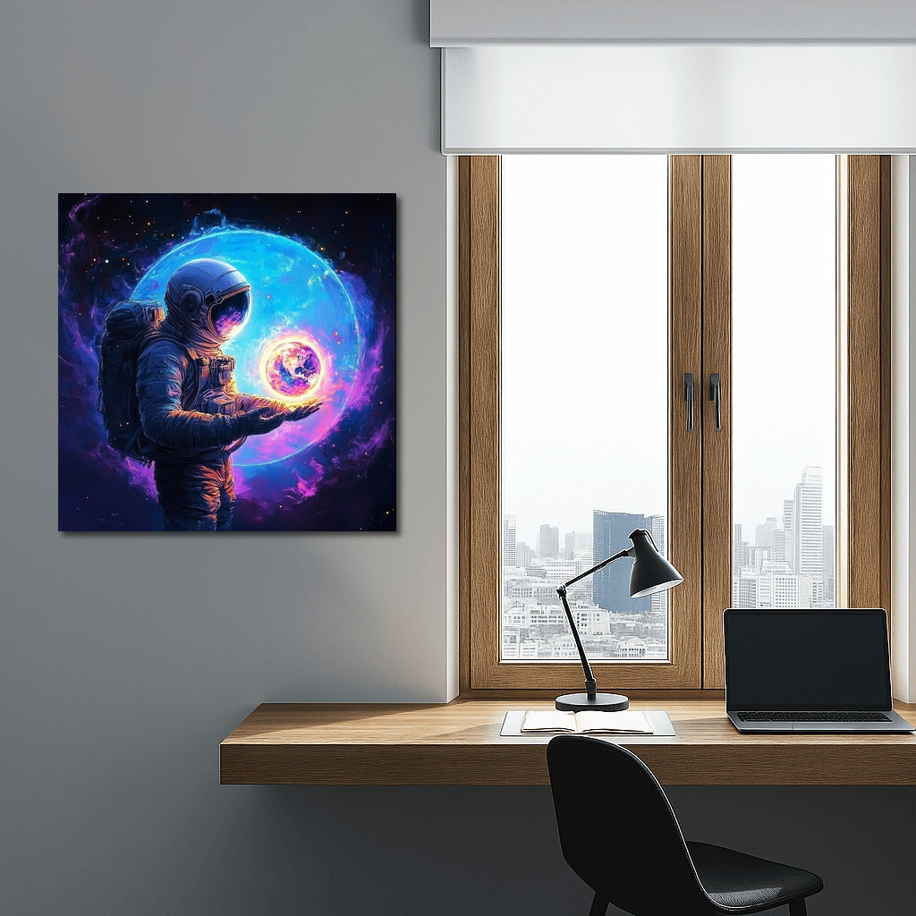 Space inspiration: a mysterious traveler holds a miniature planet. The perfect poster for dreamers and explorers. See more from the collection: Space & Astronomy Art