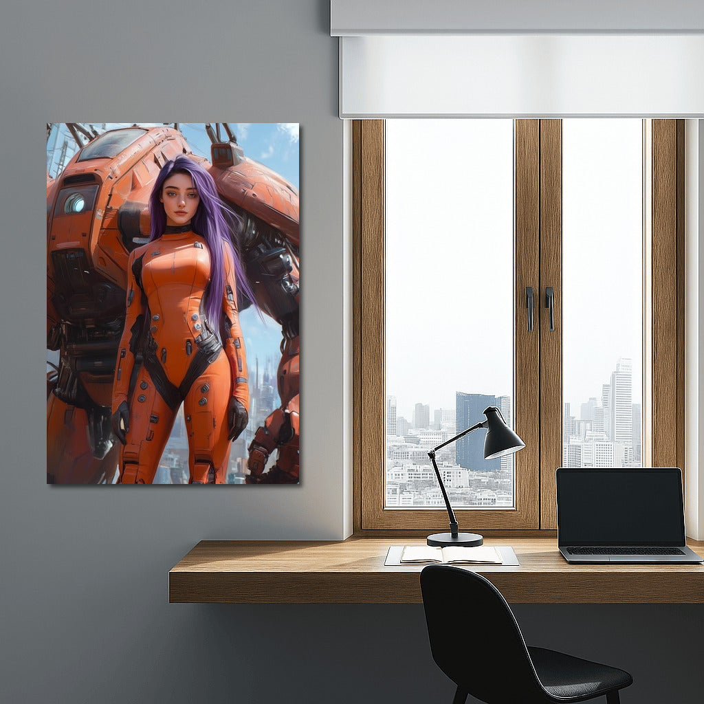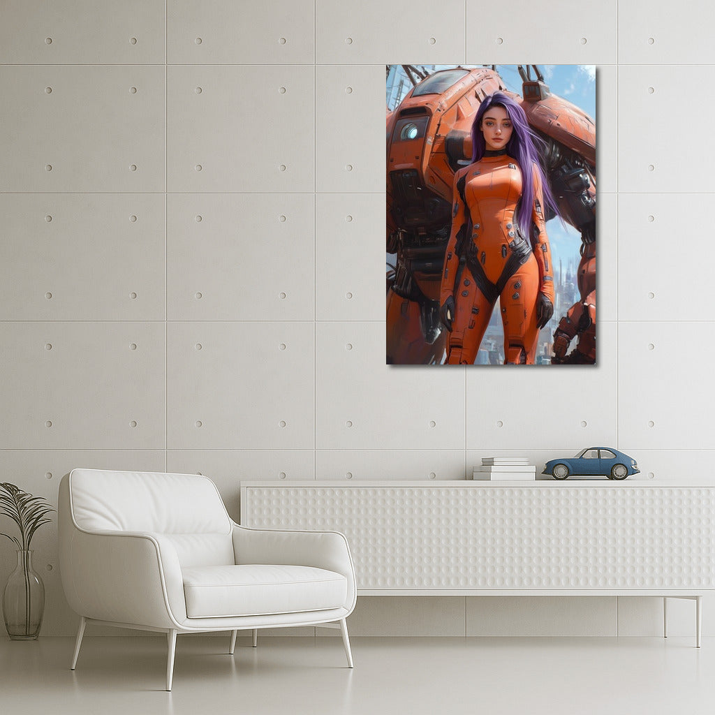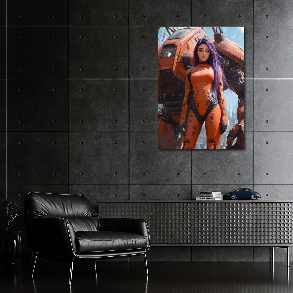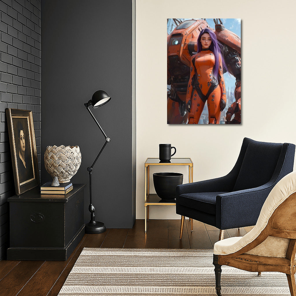 A futuristic painting with a character in an orange suit and a powerful robot in the background. A perfect poster for sci-fi fans. See more from the collection: Mixed Wall Art