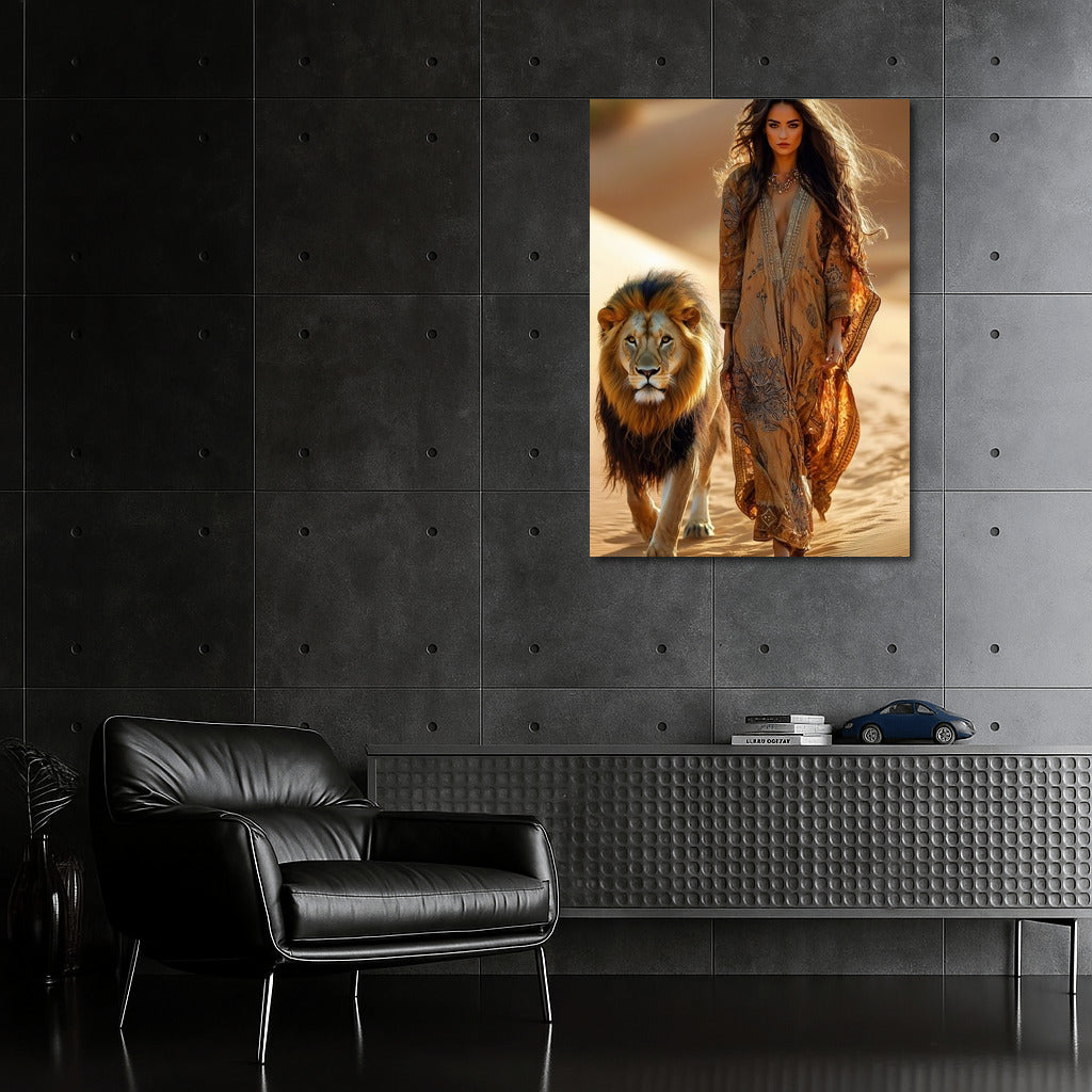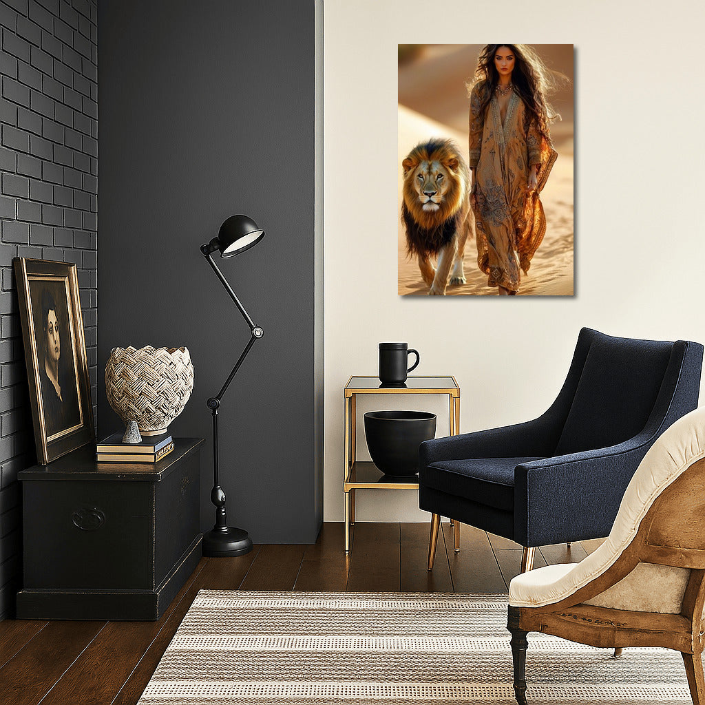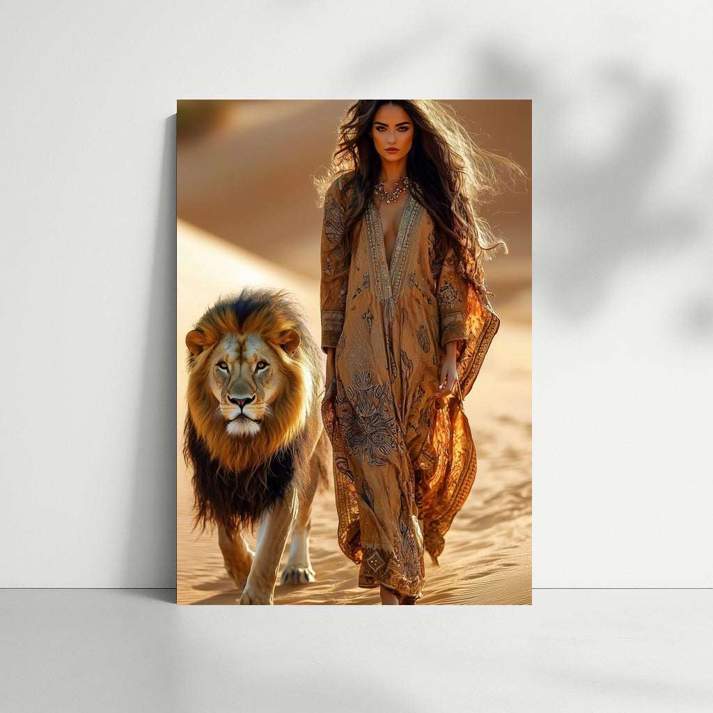 Stylish poster: a mysterious figure and a majestic lion in golden sands. Ideal wall art for a bright interior. See more from the collection: Mixed Wall Art