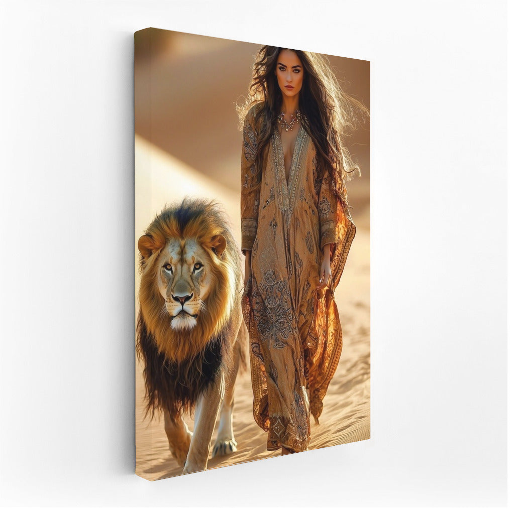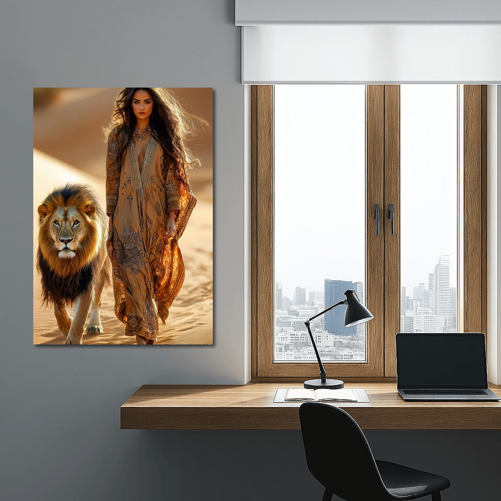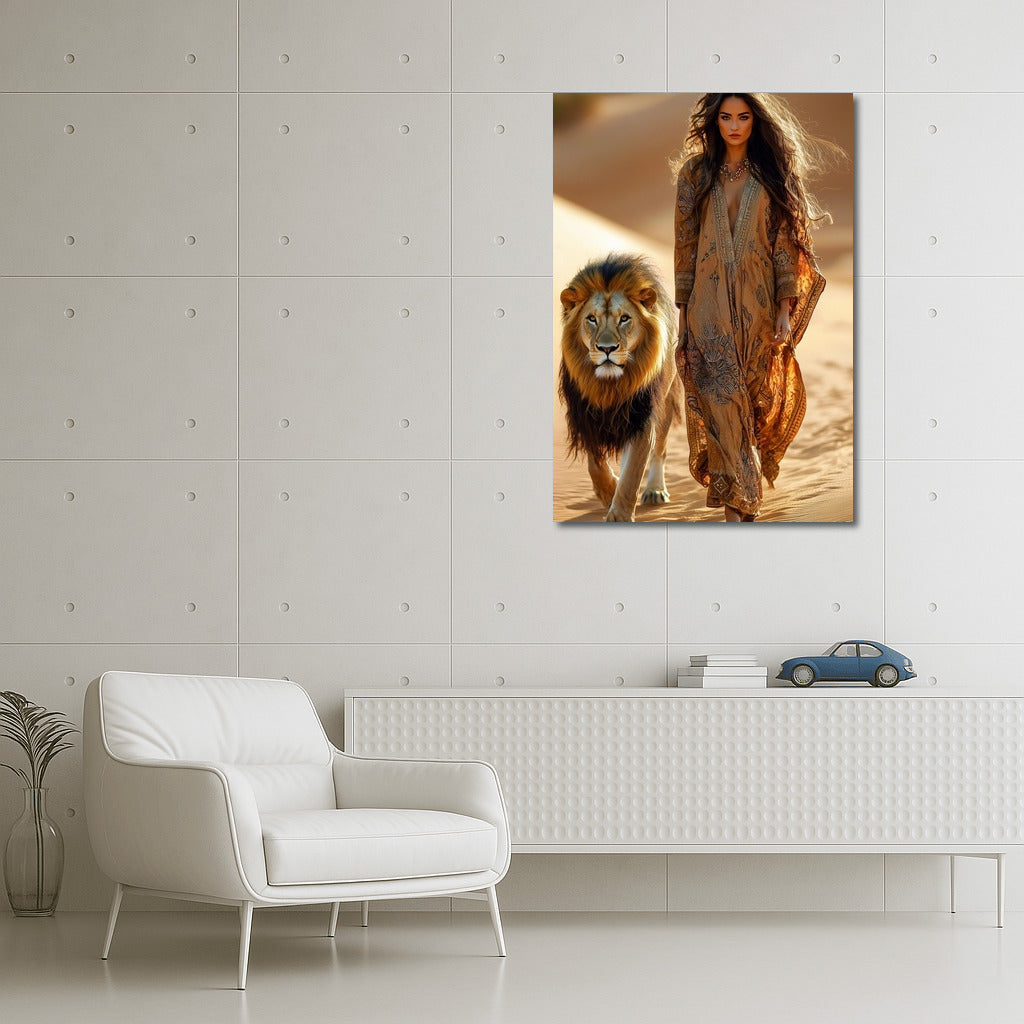 Stylish poster: a mysterious figure and a majestic lion in golden sands. Ideal wall art for a bright interior. See more from the collection: Mixed Wall Art