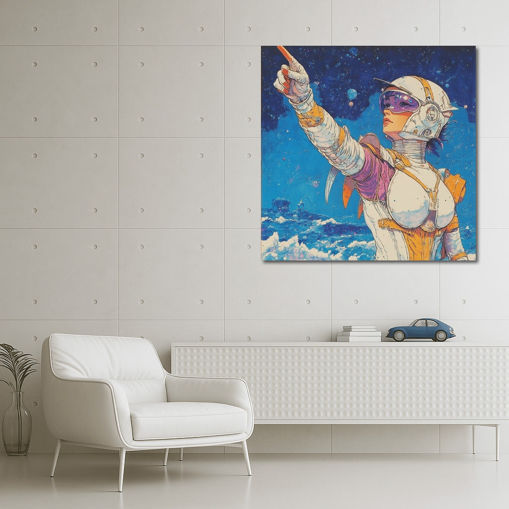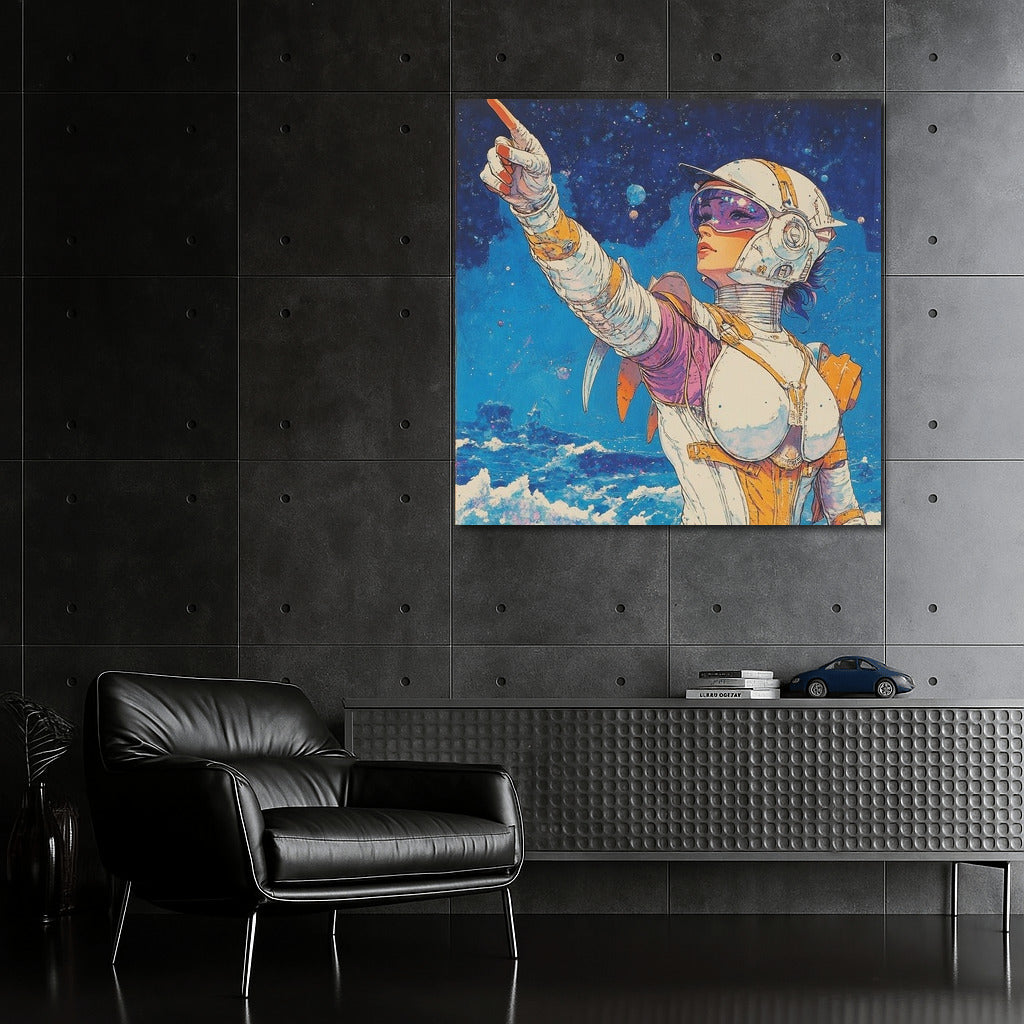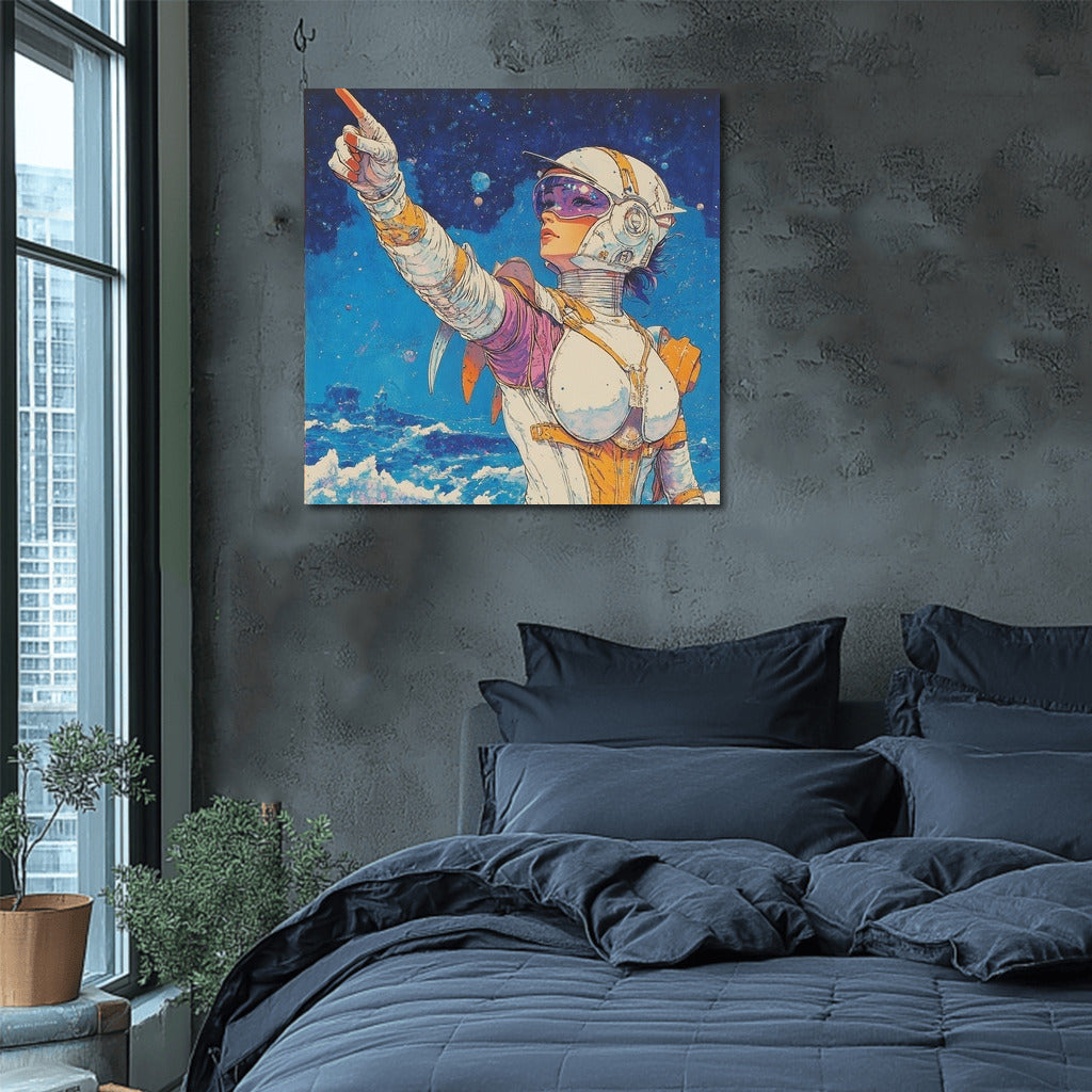 Space adventure on canvas: a mysterious figure shows the way among the stars. Add futurism to your space with this painting! See more from the collection: Mixed Wall Art