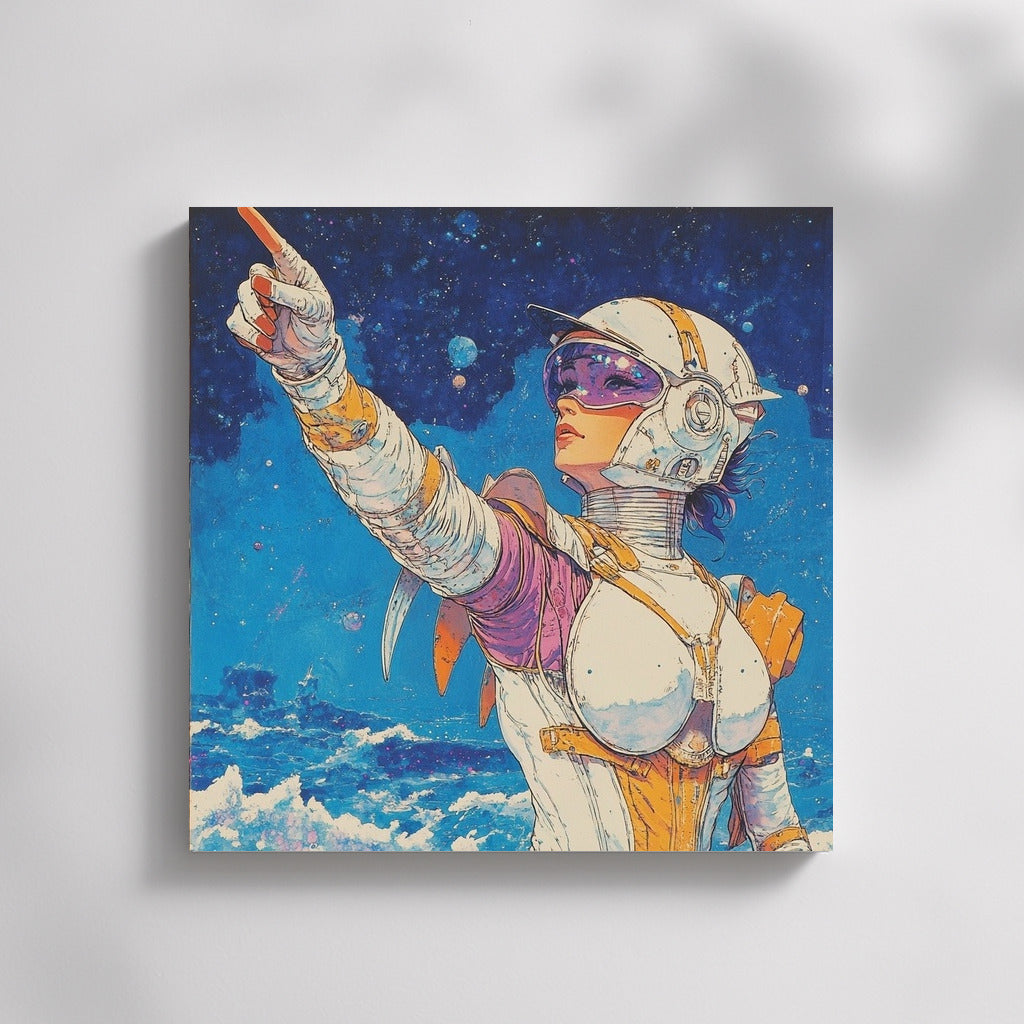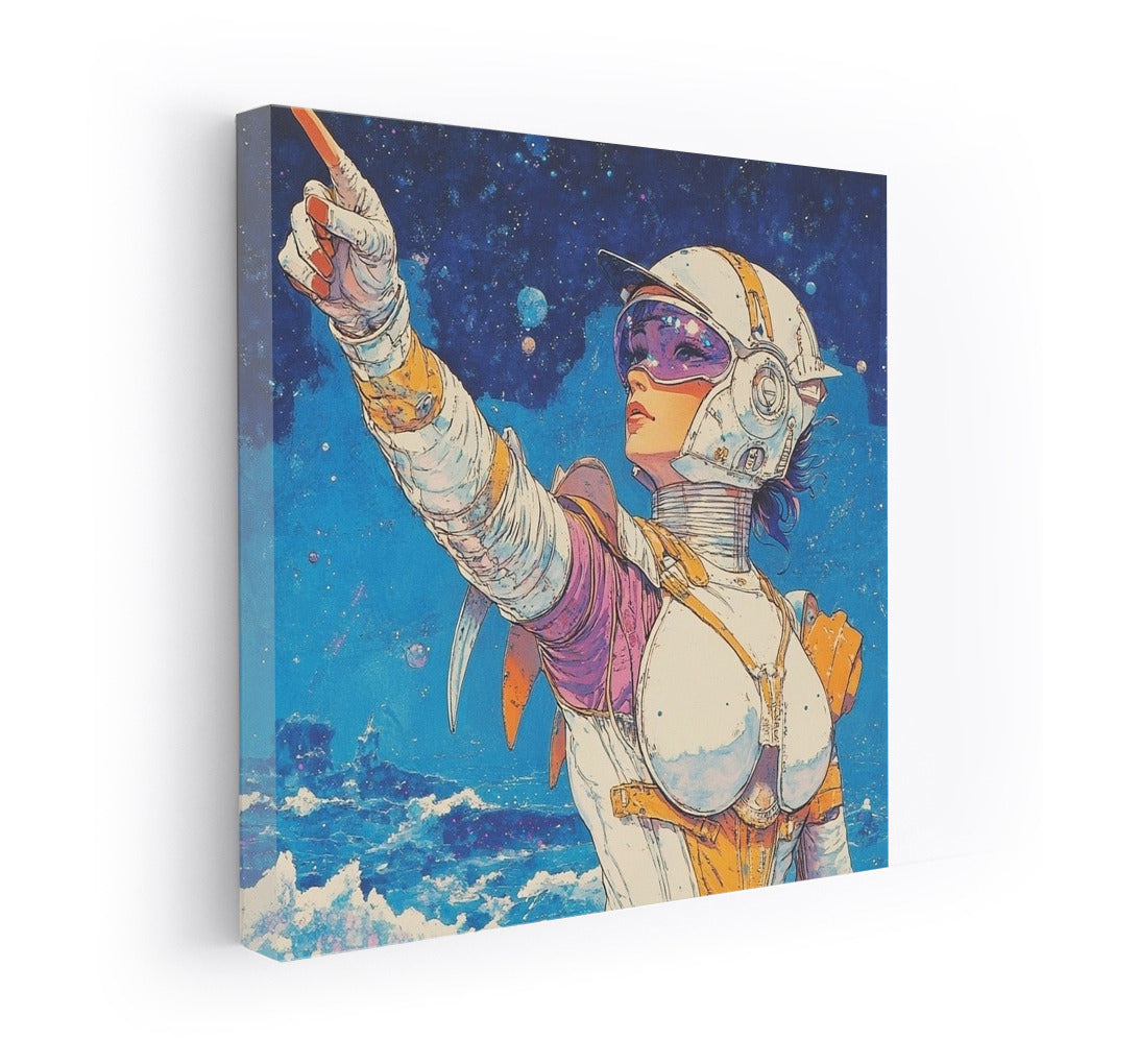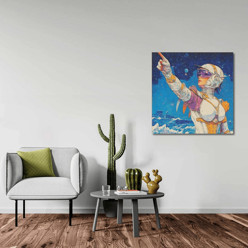 Space adventure on canvas: a mysterious figure shows the way among the stars. Add futurism to your space with this painting! See more from the collection: Mixed Wall Art