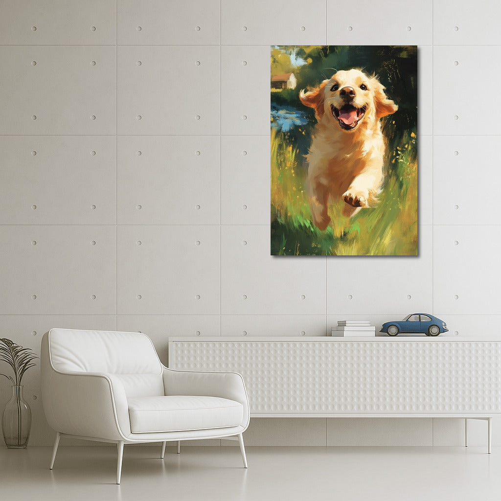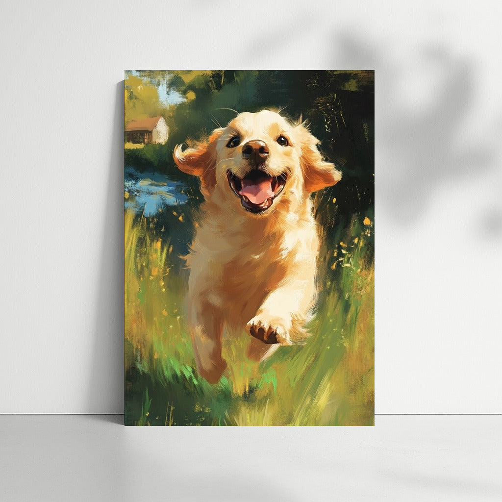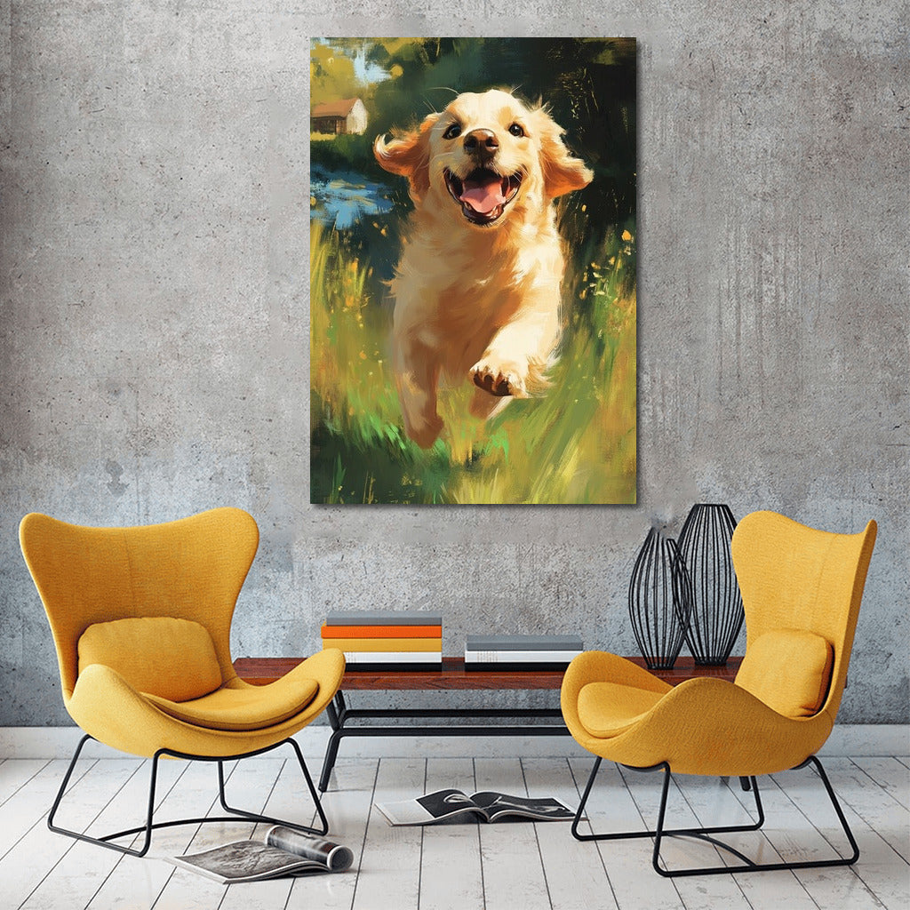 A poster with a cheerful retriever running through a blooming meadow. The joy and freedom of wall art brings life to your interior! See more from the collection: Animals Art