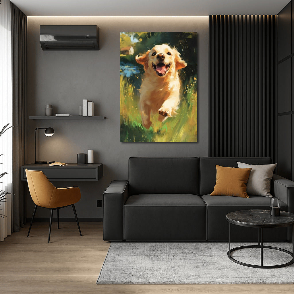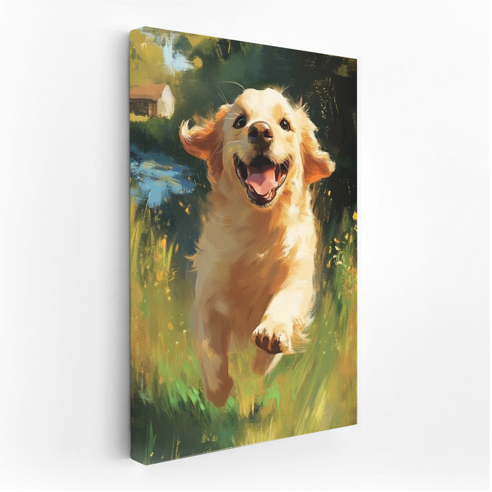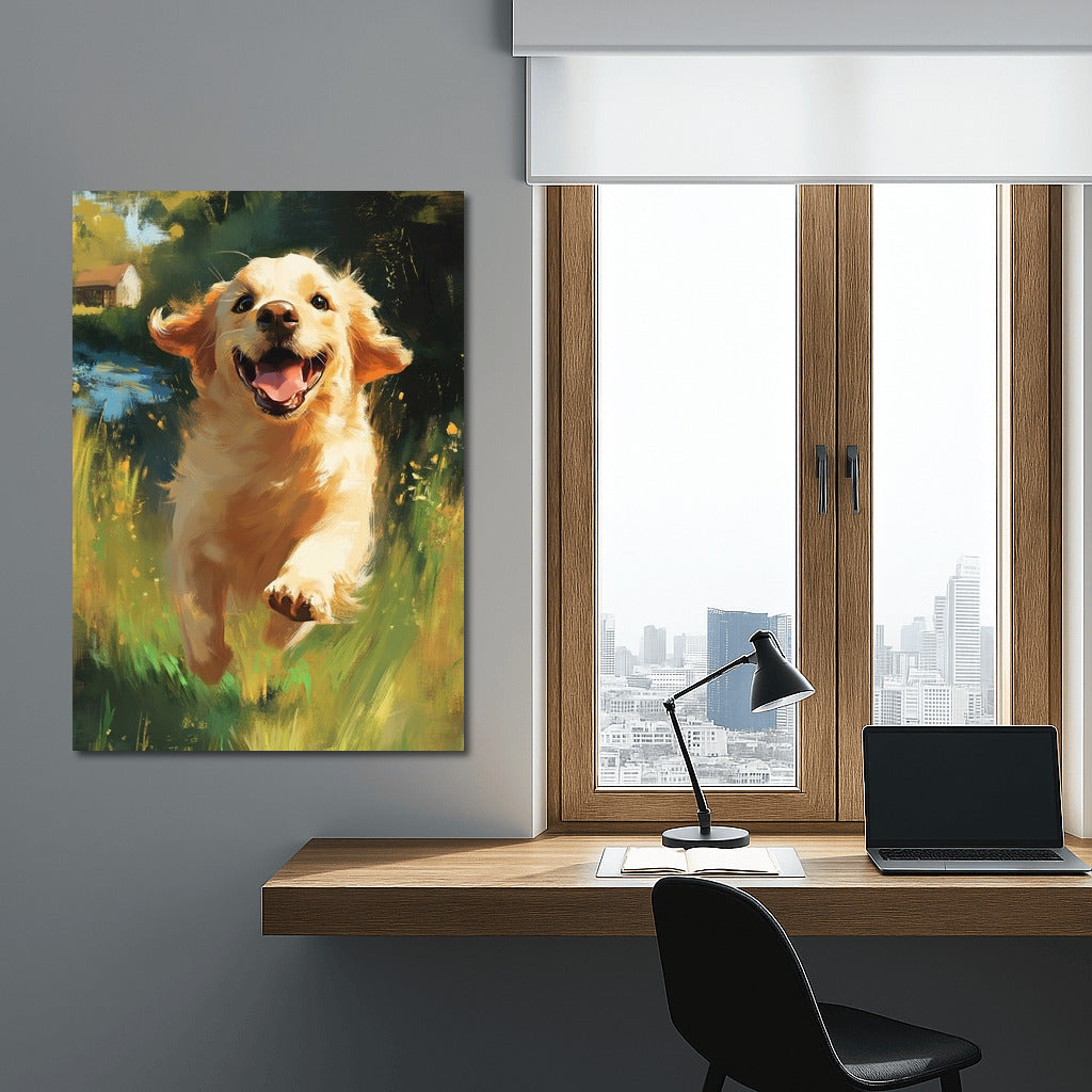 A poster with a cheerful retriever running through a blooming meadow. The joy and freedom of wall art brings life to your interior! See more from the collection: Animals Art