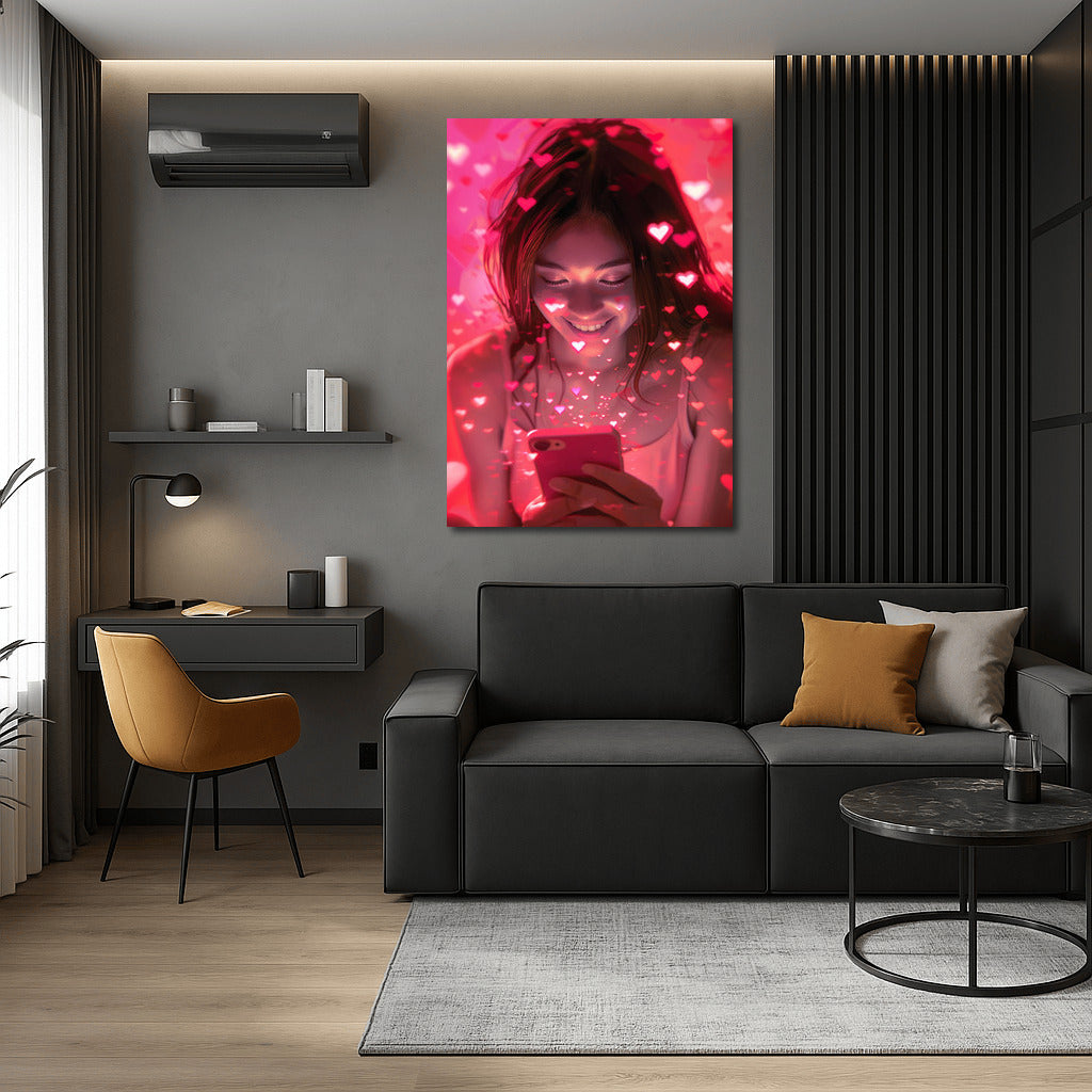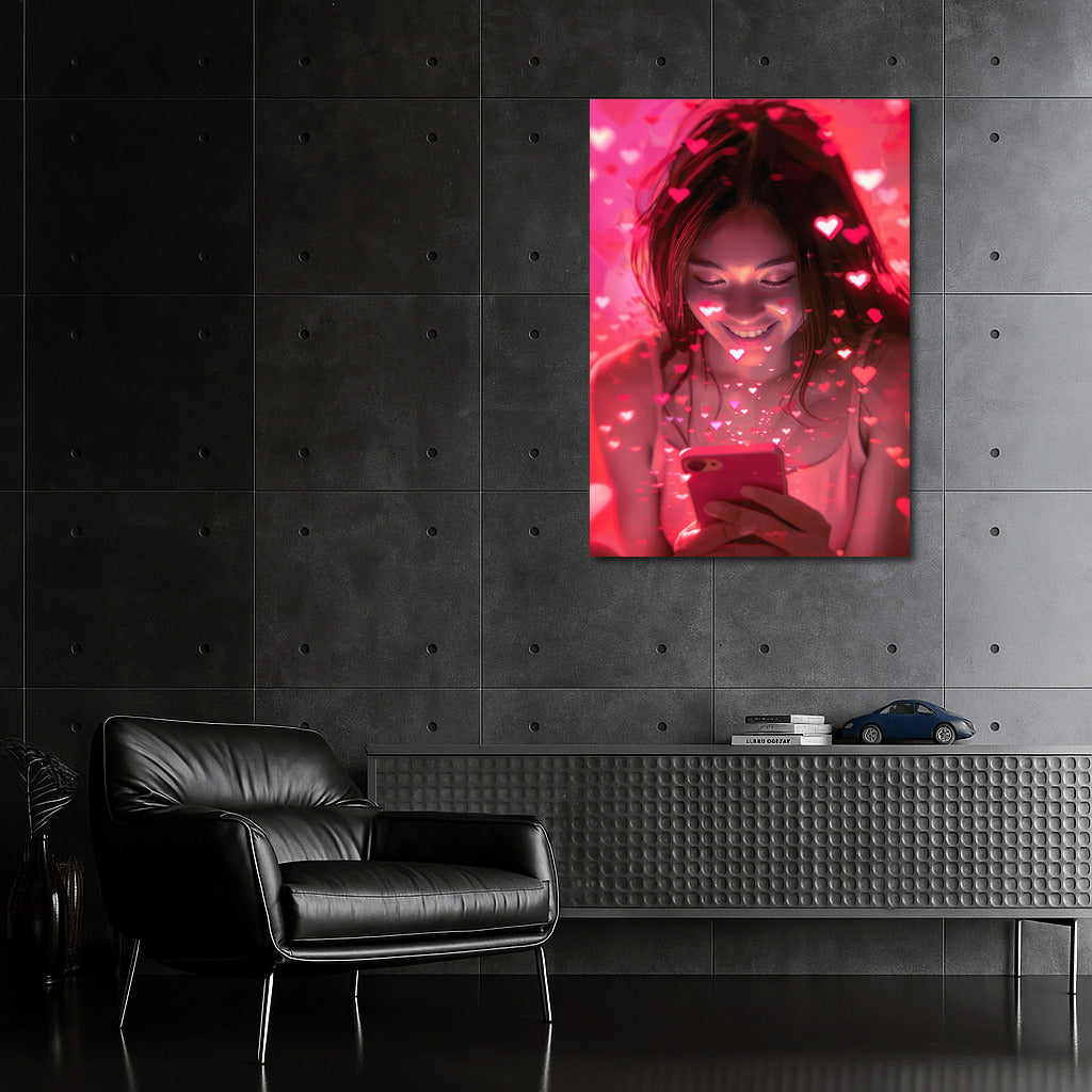 Radiating happiness, she is drowning in a sea of pink hearts. A poster that conveys joy and light in your space. See more from the collection: Wall Art with Women