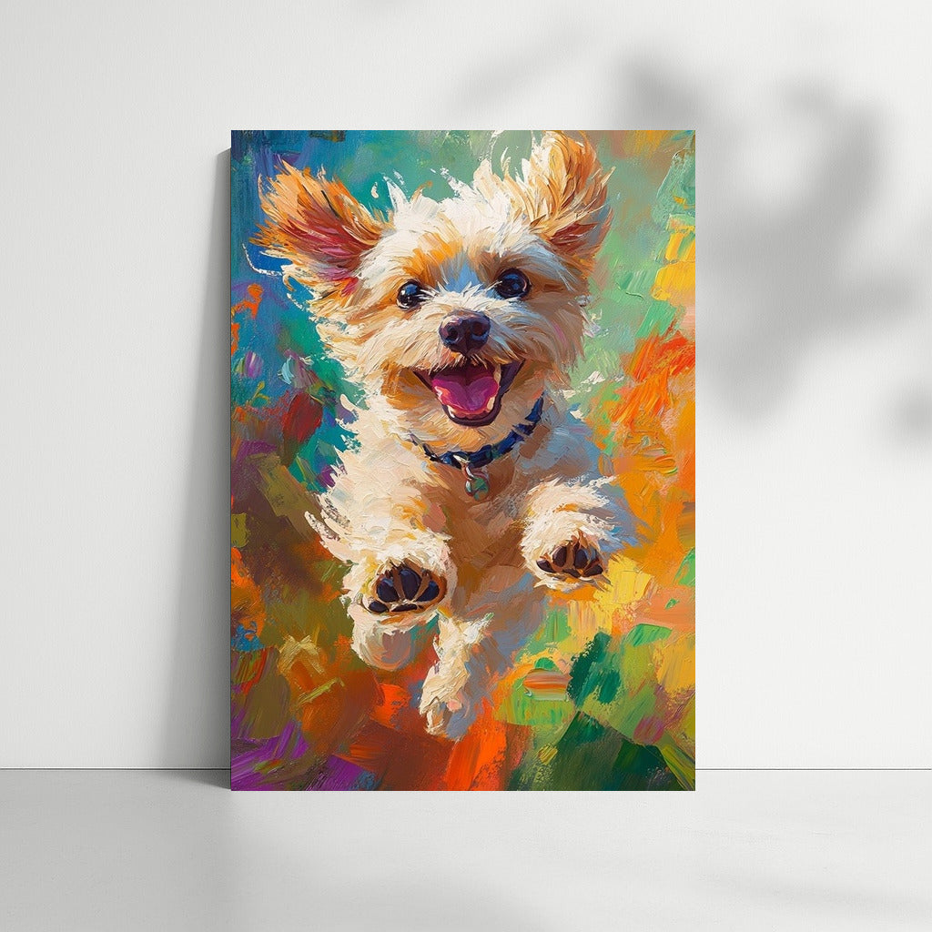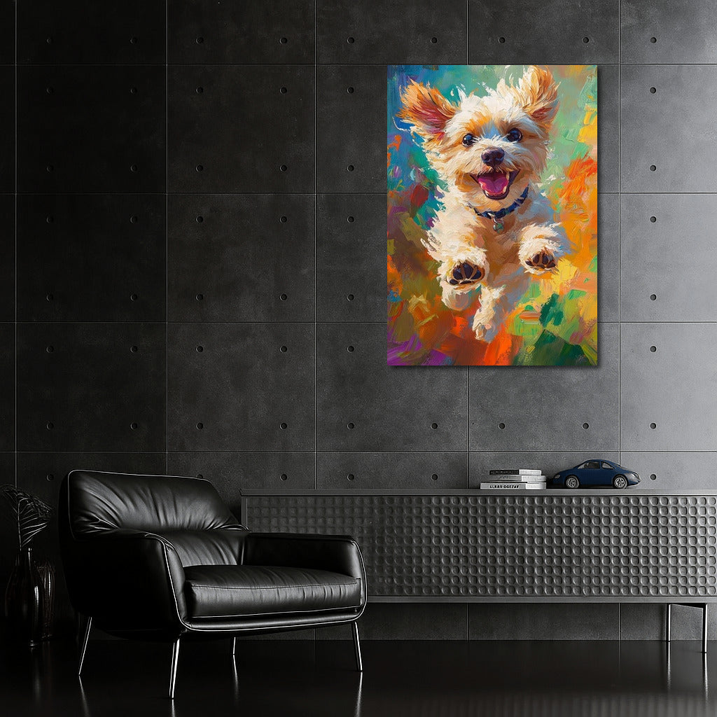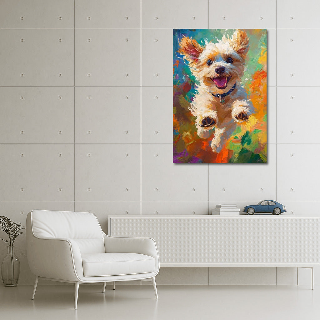 Energy and joy are beating with bright colors! Poster with jumping dog will liven up your space! Wall art for the soul. See more from the collection: Animals Art