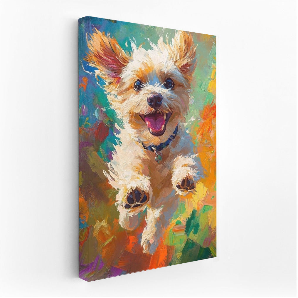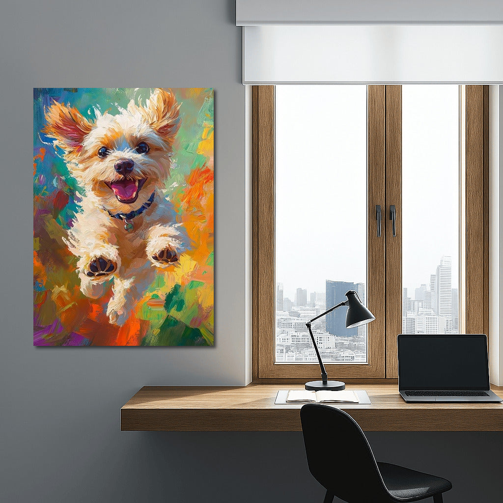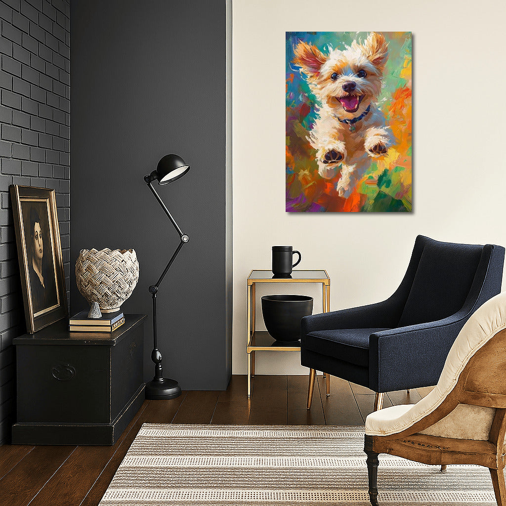 Energy and joy are beating with bright colors! Poster with jumping dog will liven up your space! Wall art for the soul. See more from the collection: Animals Art