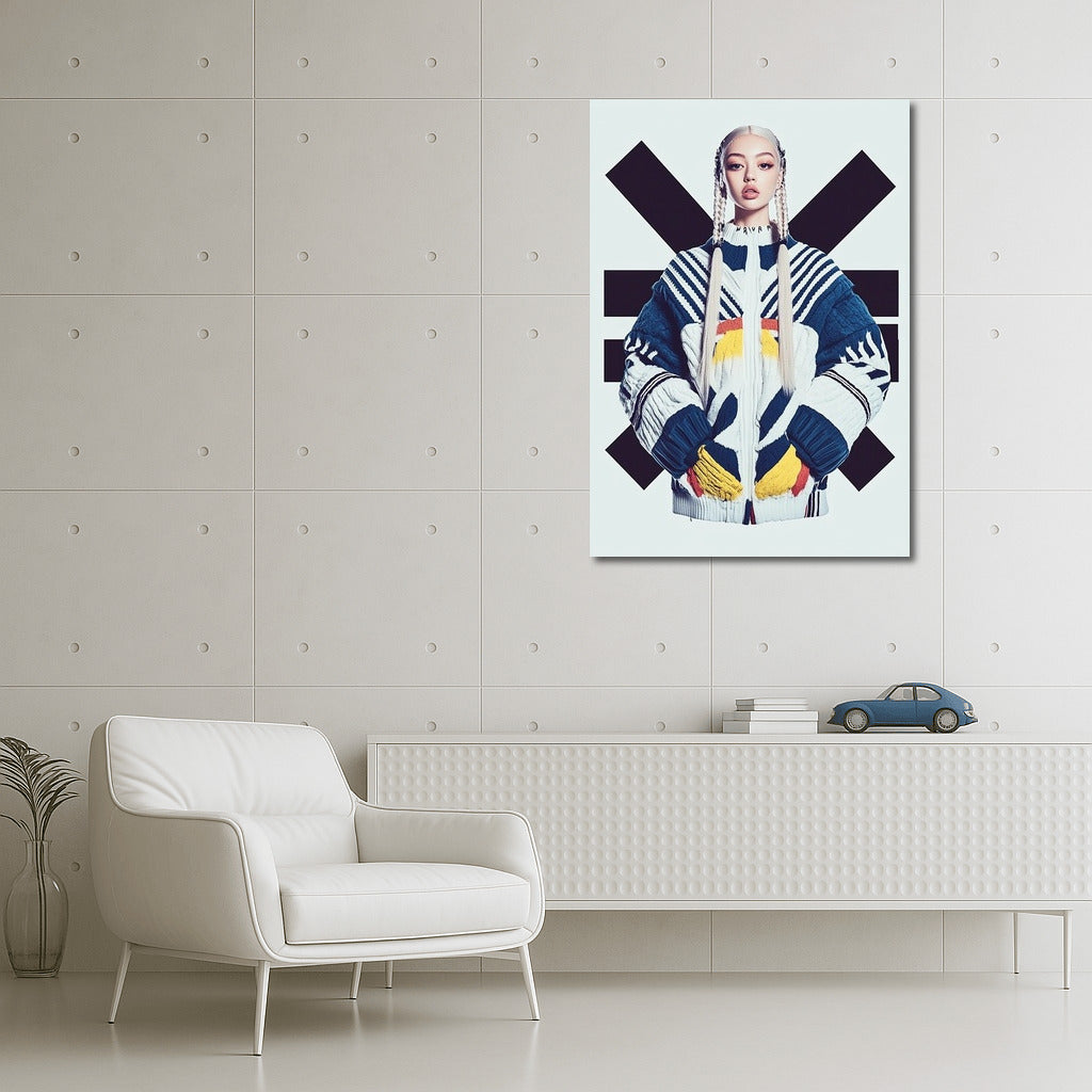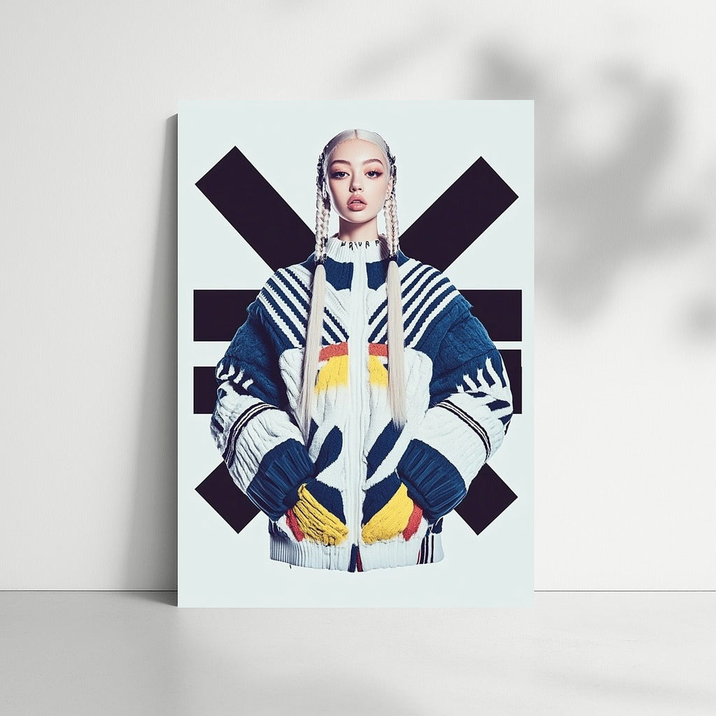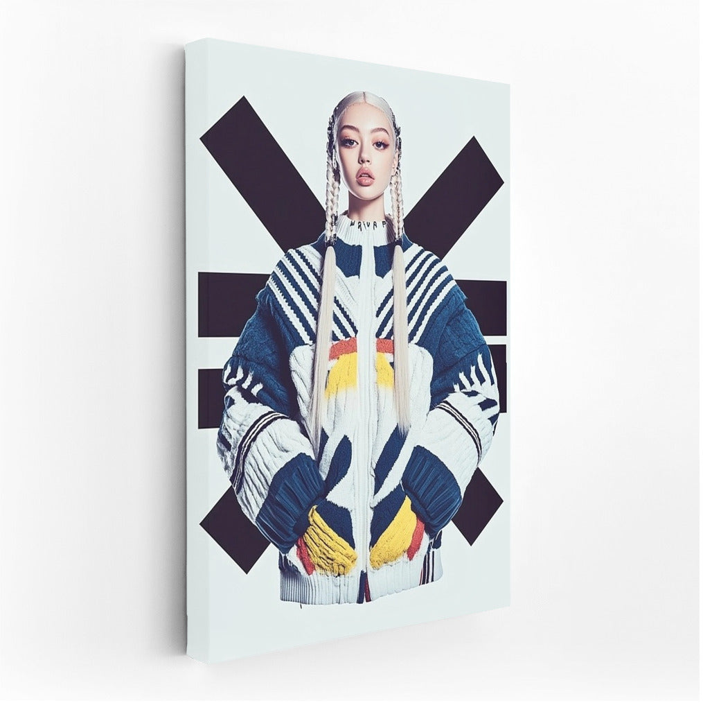 Unique poster: girl in stylish sweater on geometric background. Modern wall art for your interior. See more from the collection: Hipsters Art