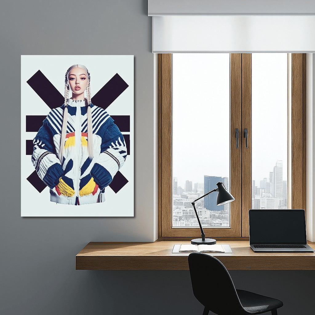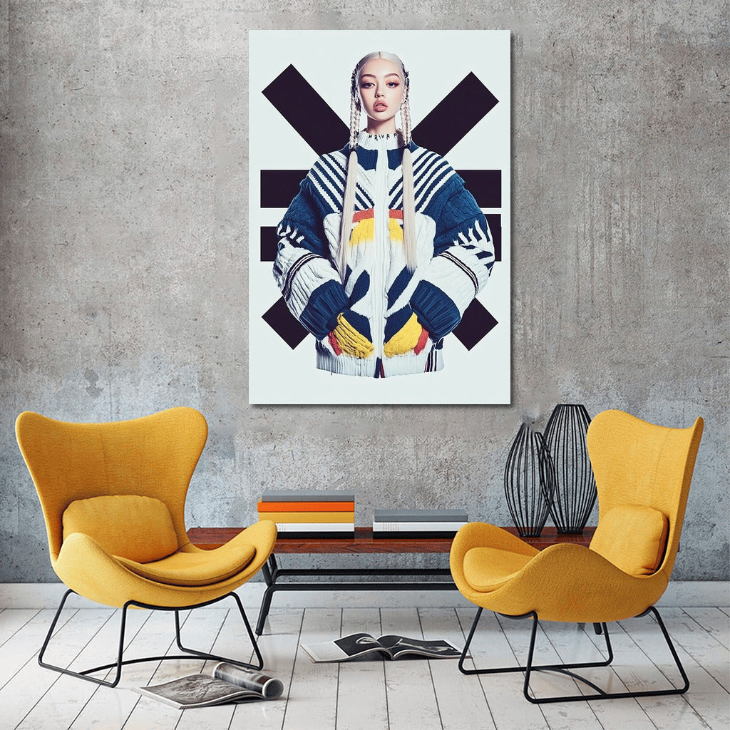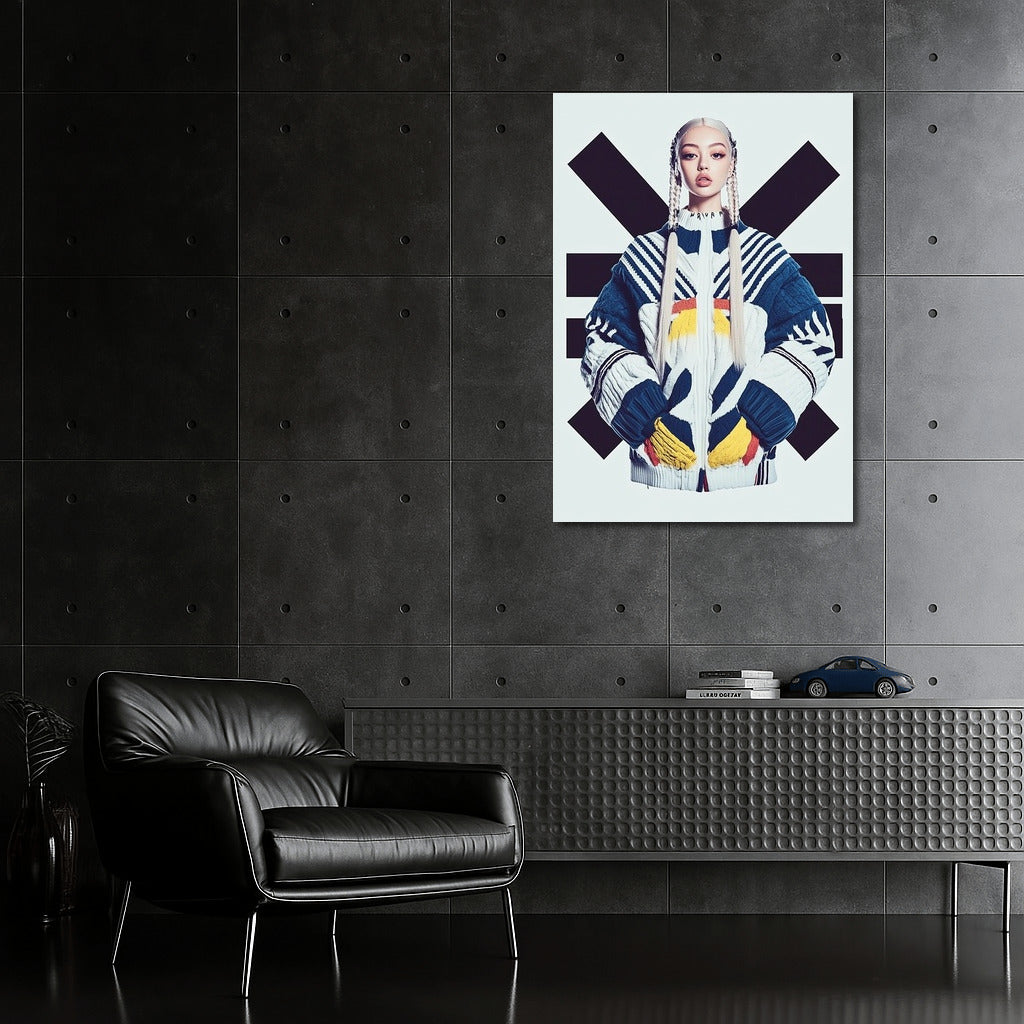 Unique poster: girl in stylish sweater on geometric background. Modern wall art for your interior. See more from the collection: Hipsters Art
