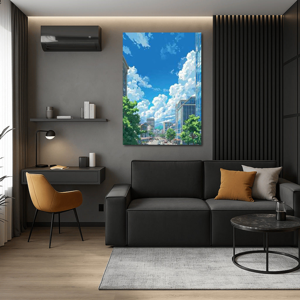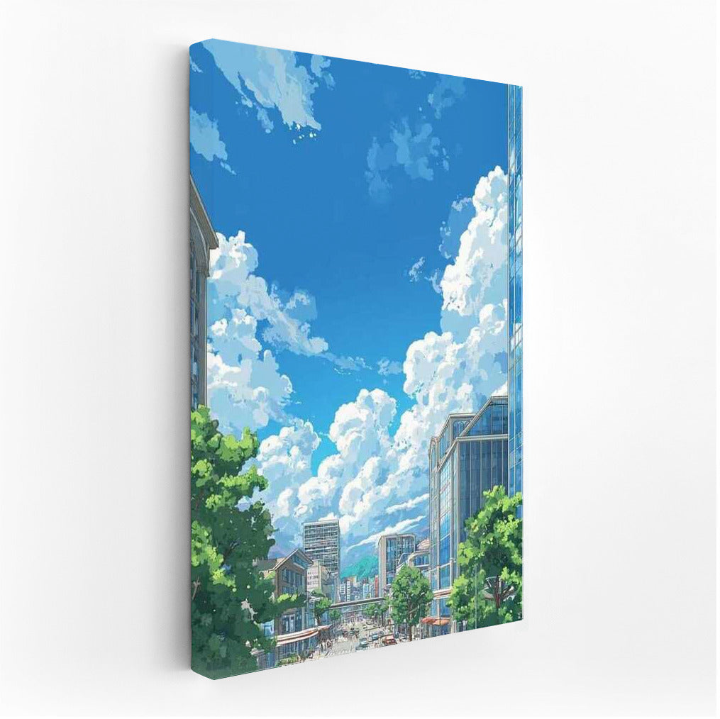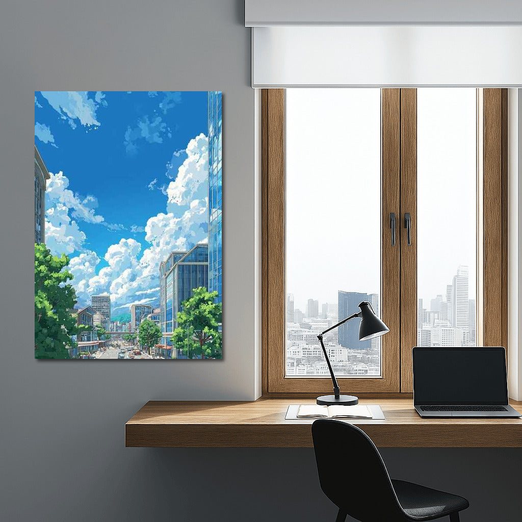 Harmony of Architecture: Busy Street and Flowing Clouds Wall Art