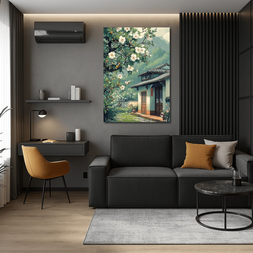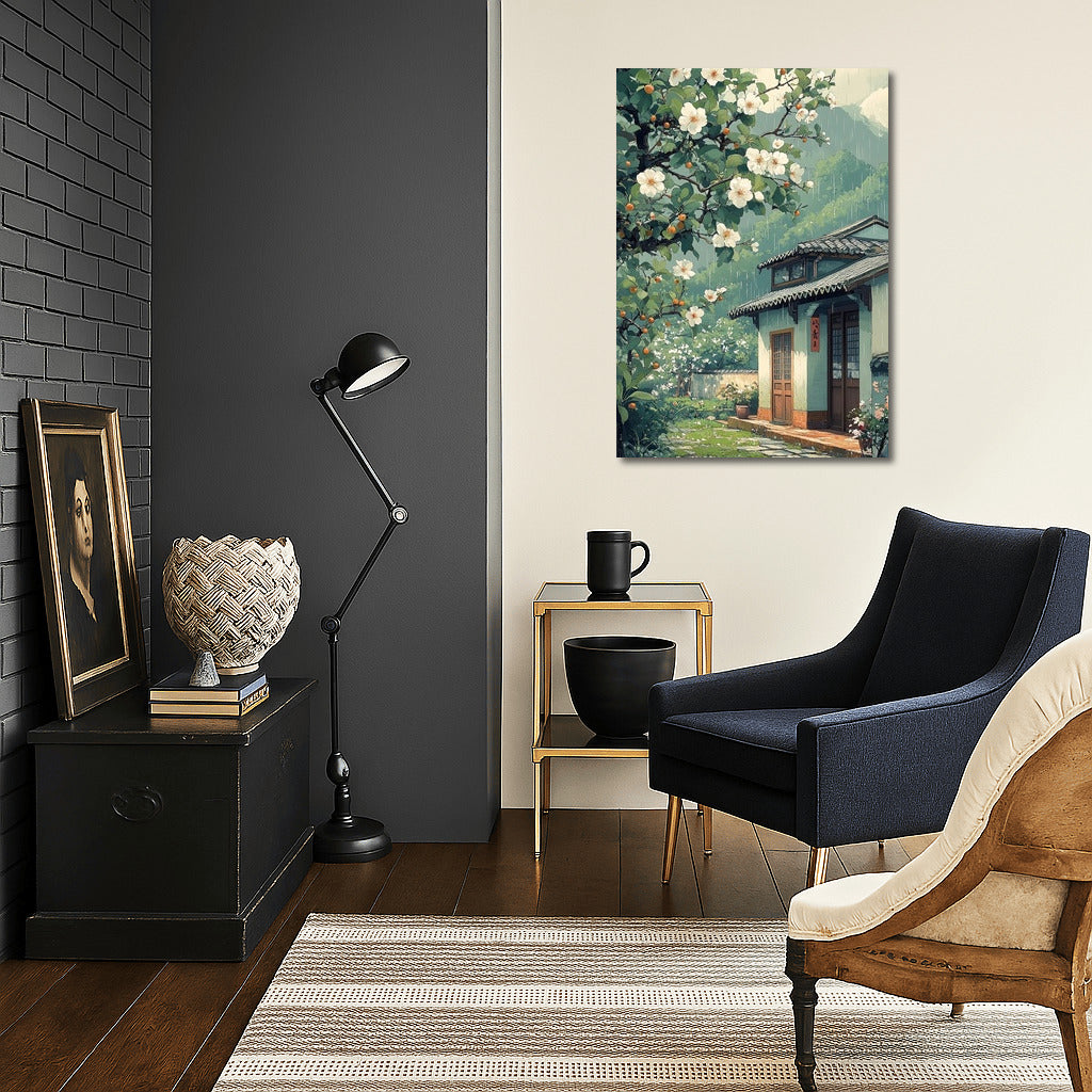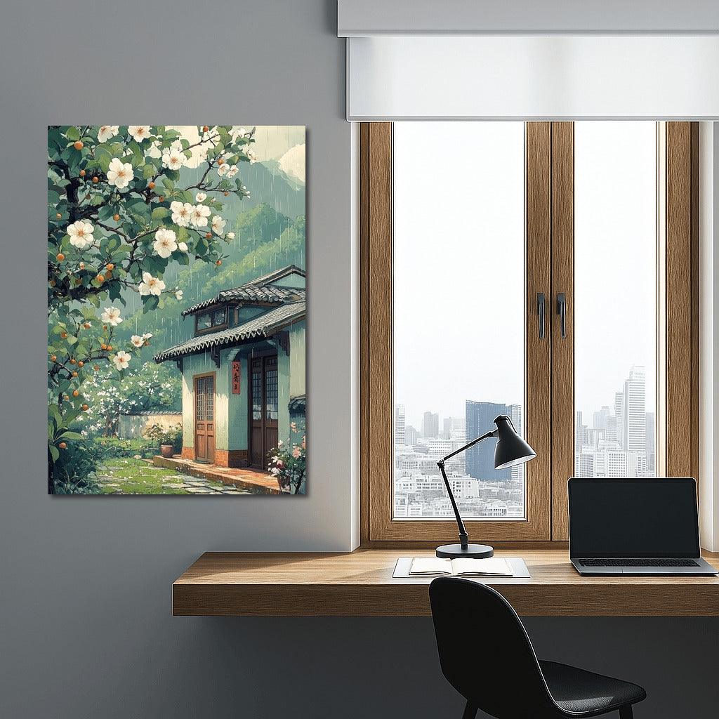 Immerse yourself in the magic of nature with this painting: a house near the mountains, blossoms and rain create an atmosphere of comfort and peace. Wall art. See more from the collection: Anime & Manga genres Art