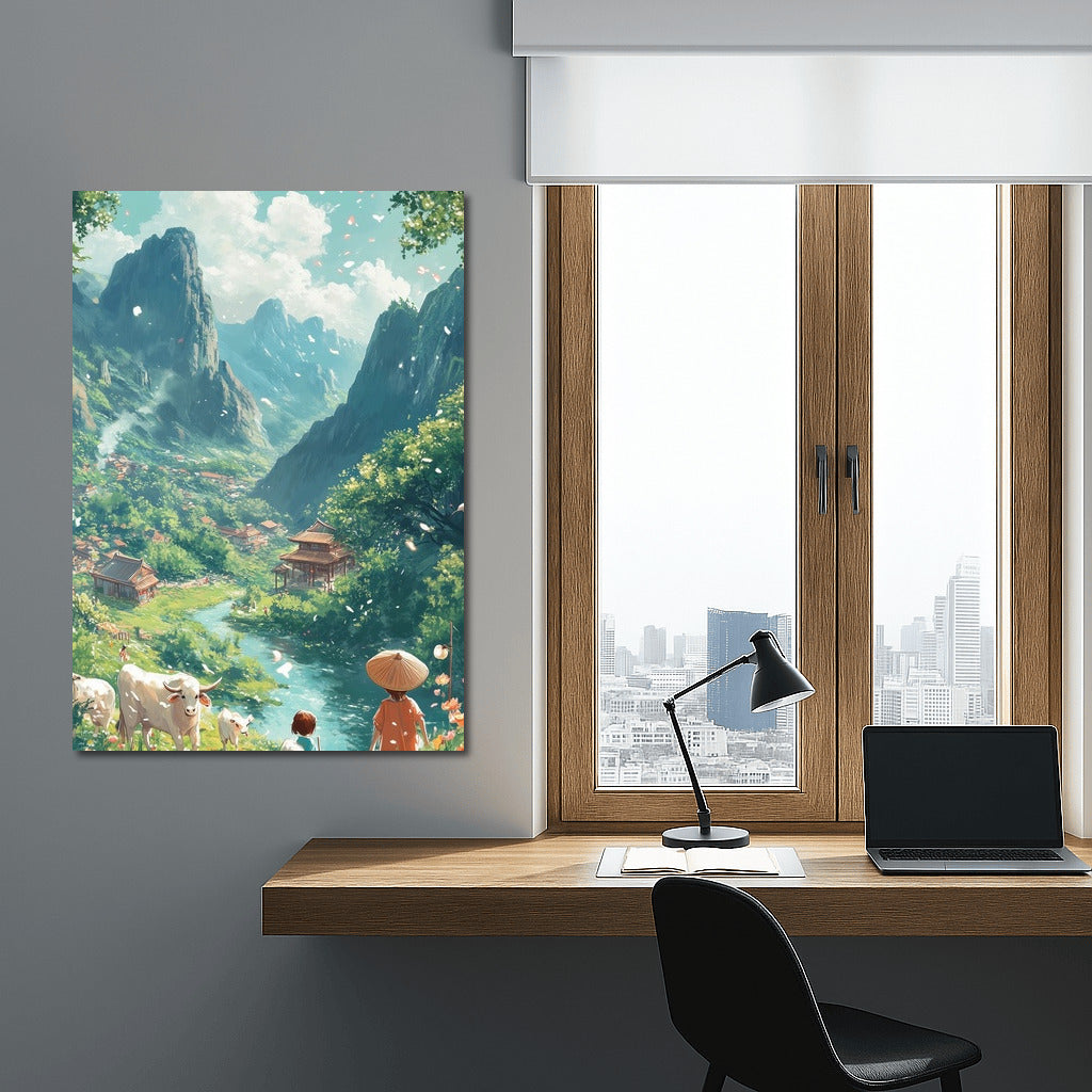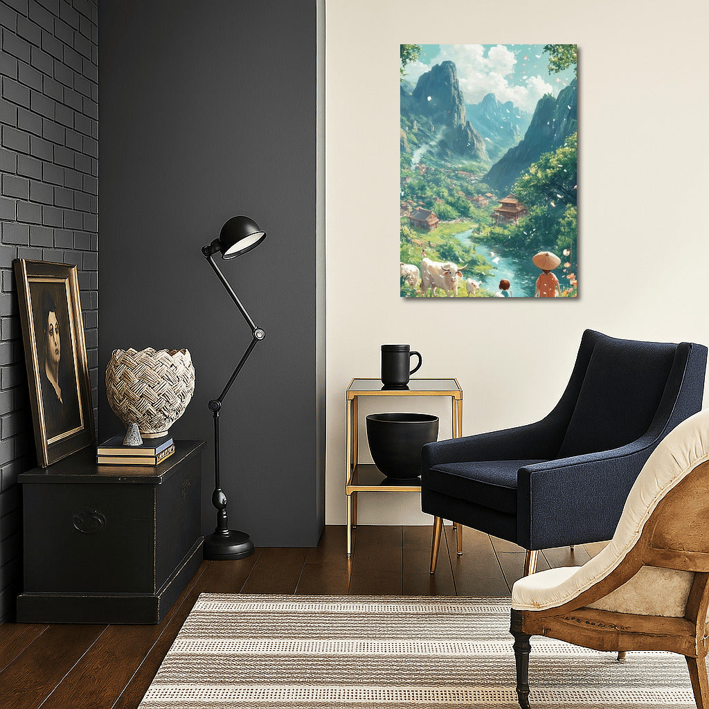 Dive into a world of harmony with this paintingsque poster: mountains, flowers and the idyll of rural life in a quiet village. Wall art. See more from the collection: Anime & Manga genres Art