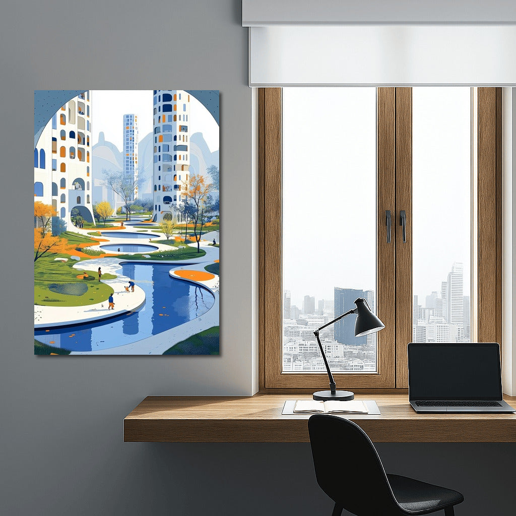 Futuristic wall art: a dream city with winding rivers and parks. Add a twist to your interior with this poster! See more from the collection: Mixed Wall Art