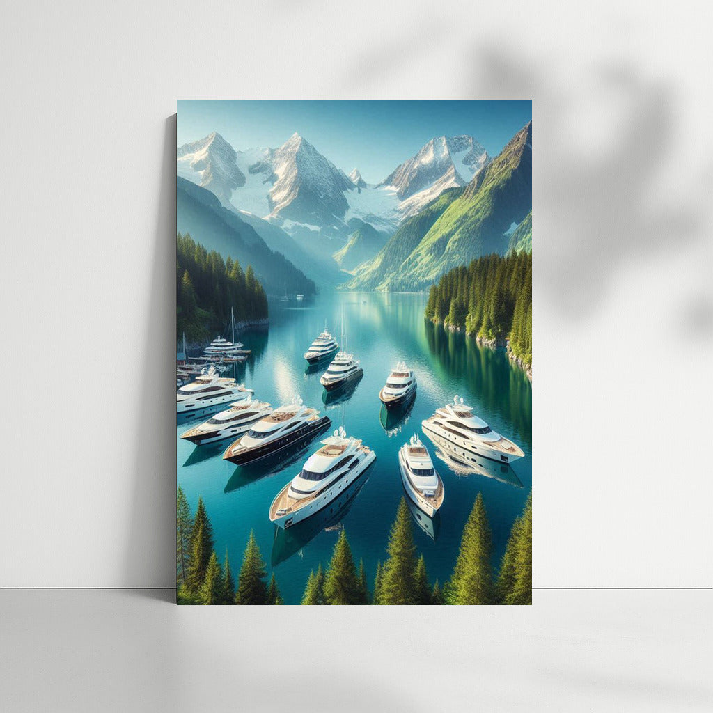 Immerse yourself in the tranquility of Yachts Harbor 3: a poster of yachts surrounded by majestic mountains and crystal clear water. Wall inspiration! See more from the collection: Transport Art