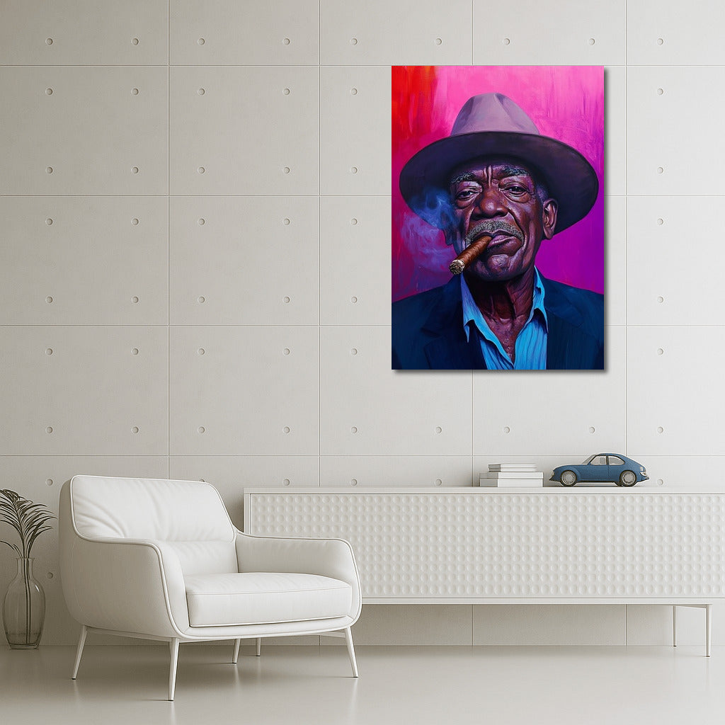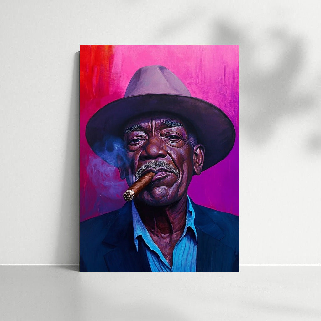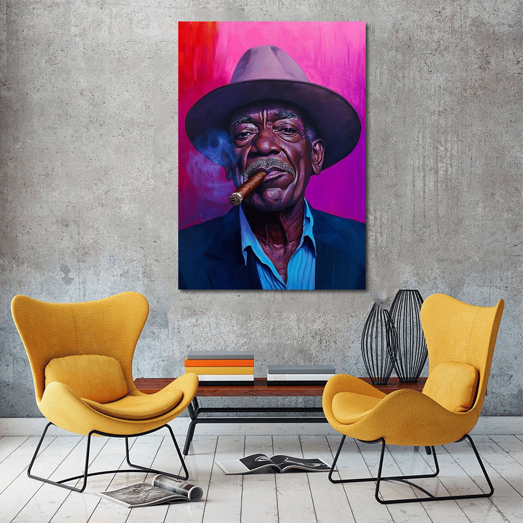 A striking poster with an expressive portrait in a hat and with a cigar. Wall art that adds charisma and style to your interior. See more from the collection: Mixed Wall Art