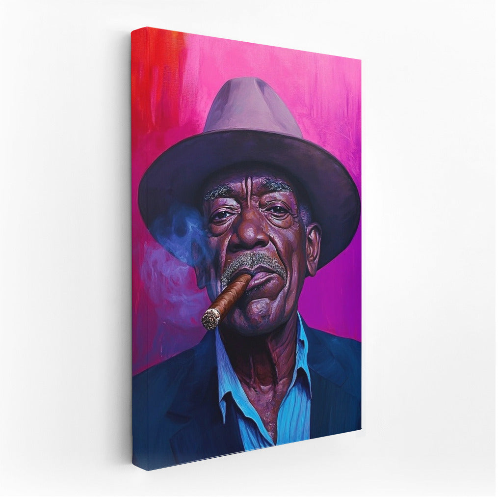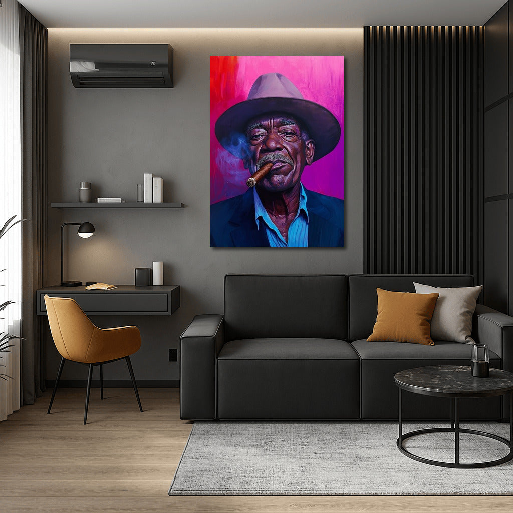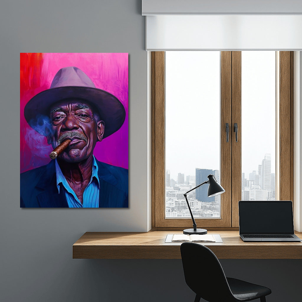 A striking poster with an expressive portrait in a hat and with a cigar. Wall art that adds charisma and style to your interior. See more from the collection: Mixed Wall Art