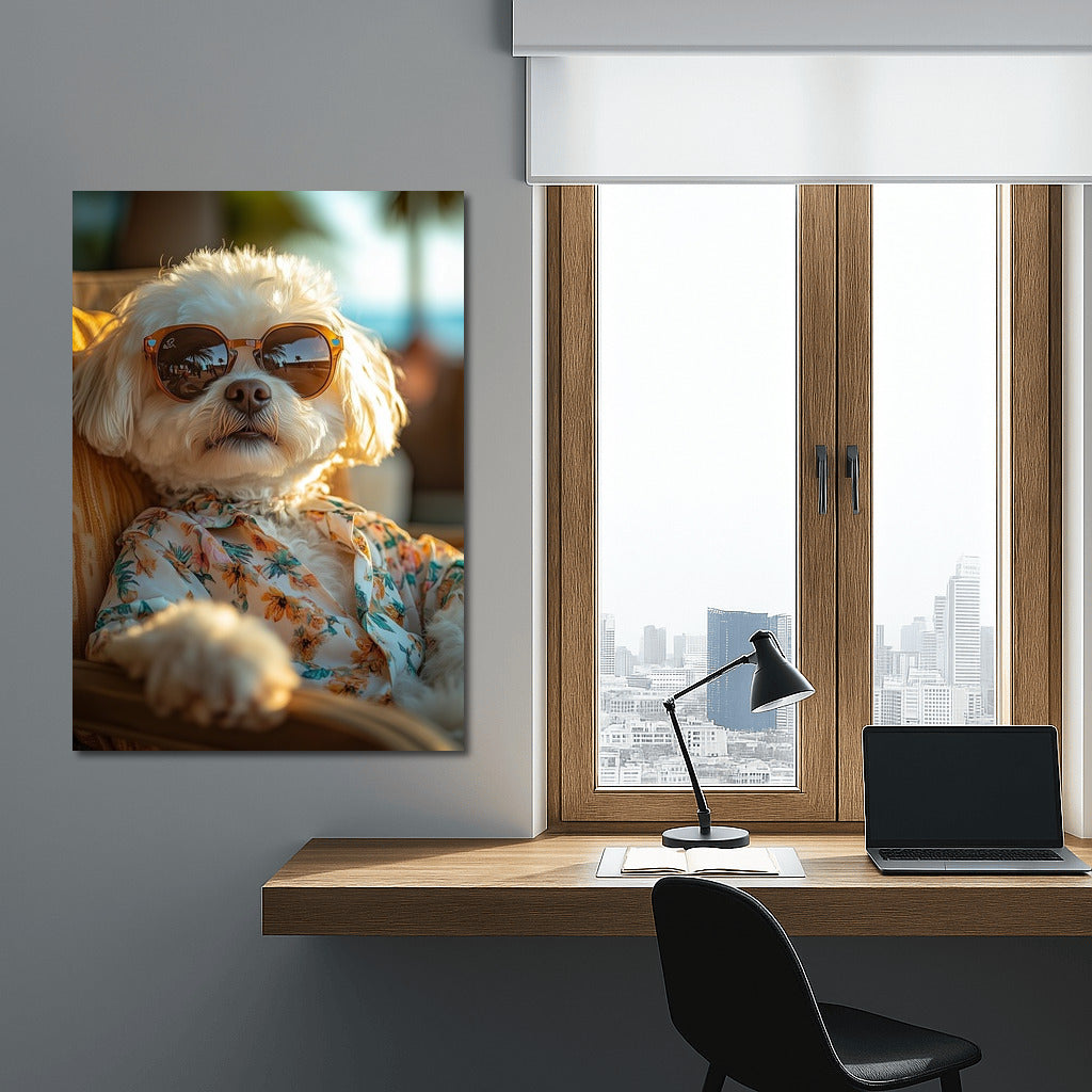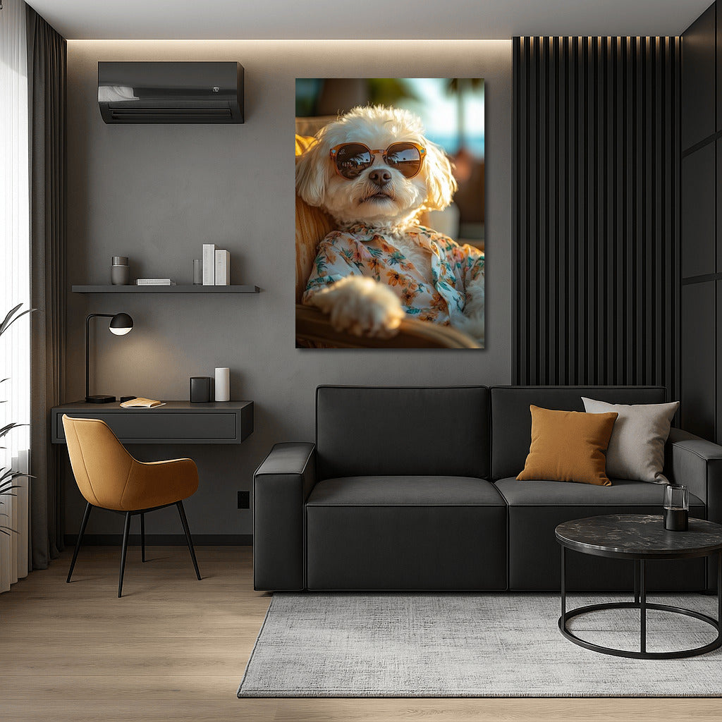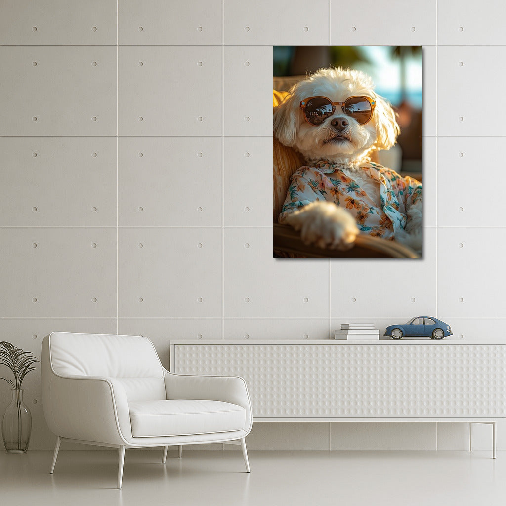Charming poster: a stylish dog in sunglasses and a Hawaiian shirt will add humor and coziness to your interior! See more from the collection: Animals Art