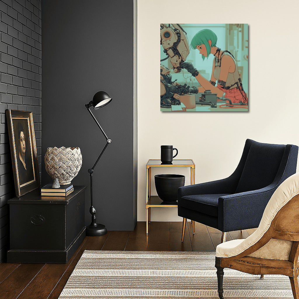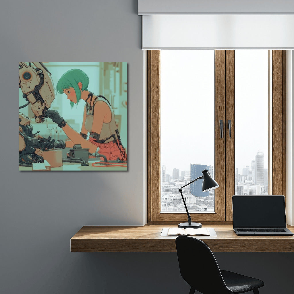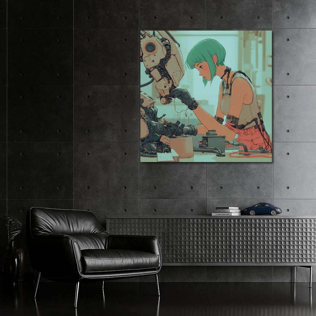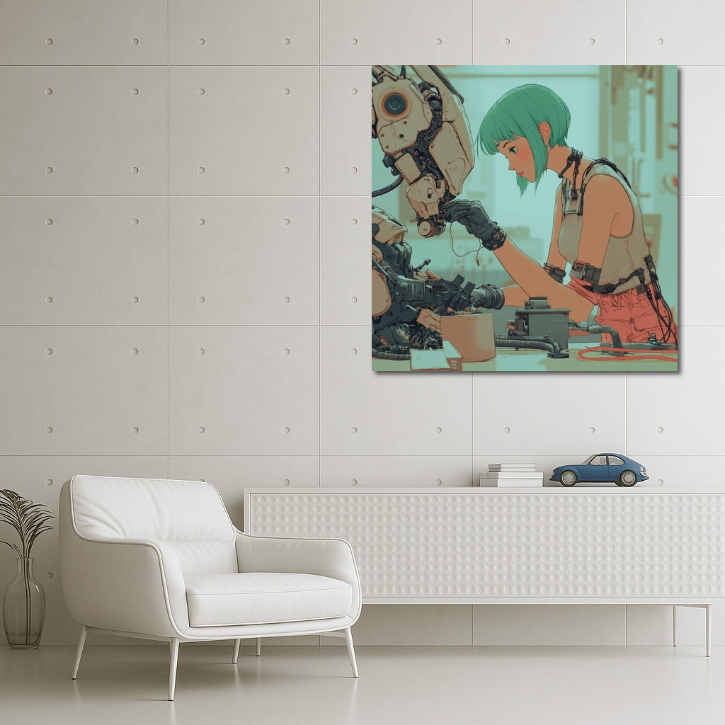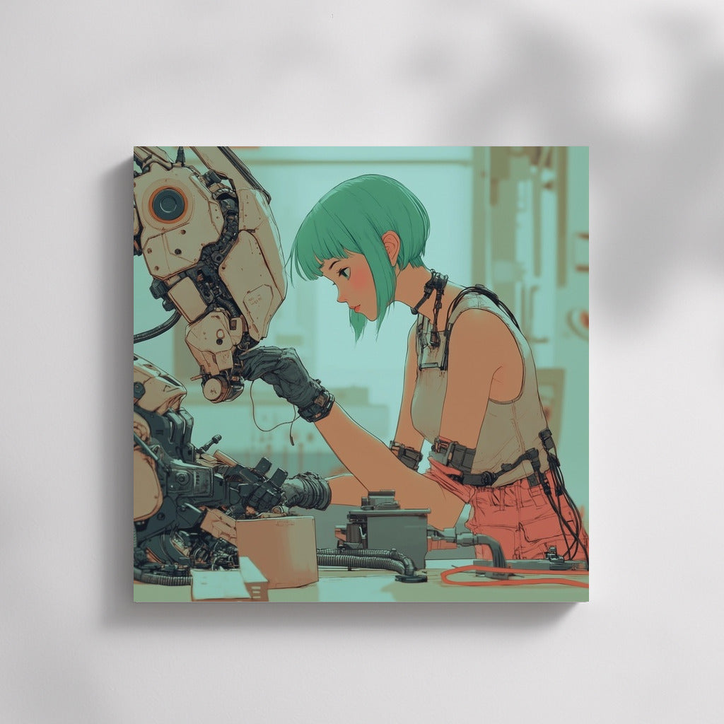 Dive into the future with this poster of an engineer lovingly fixing a robot. Perfect wall art for techies! See more from the collection: Anime & Manga genres Art