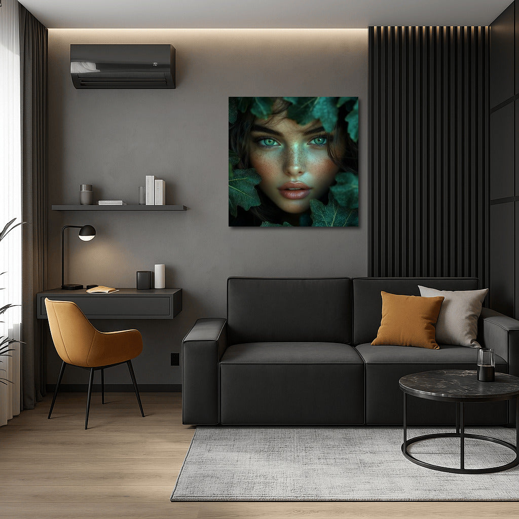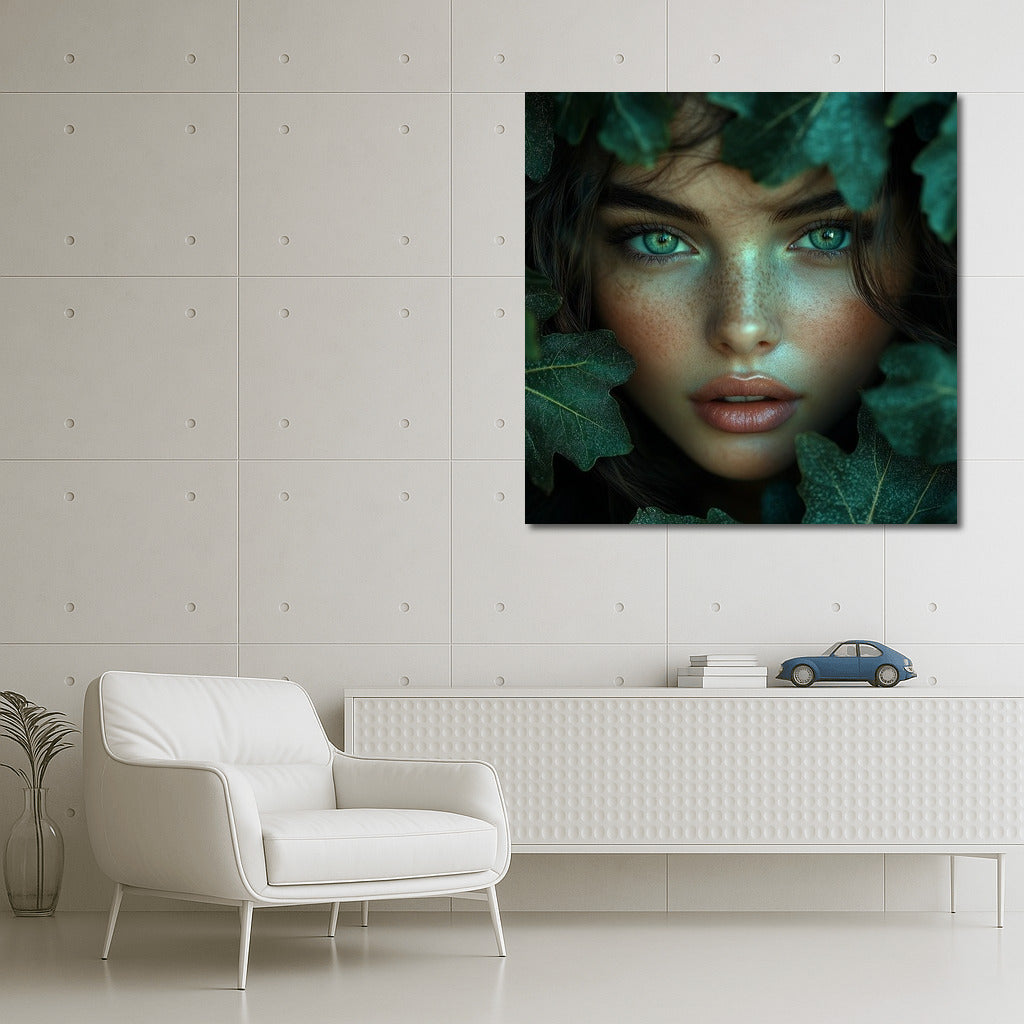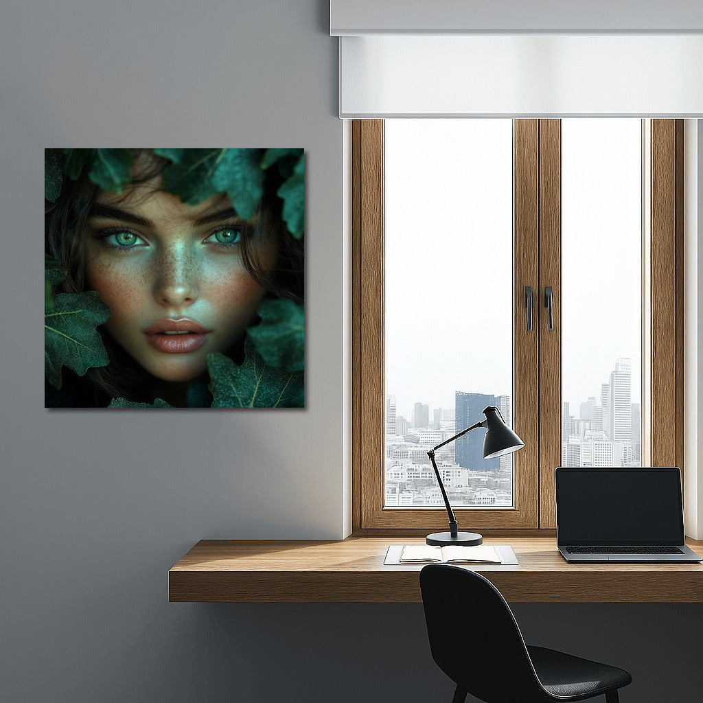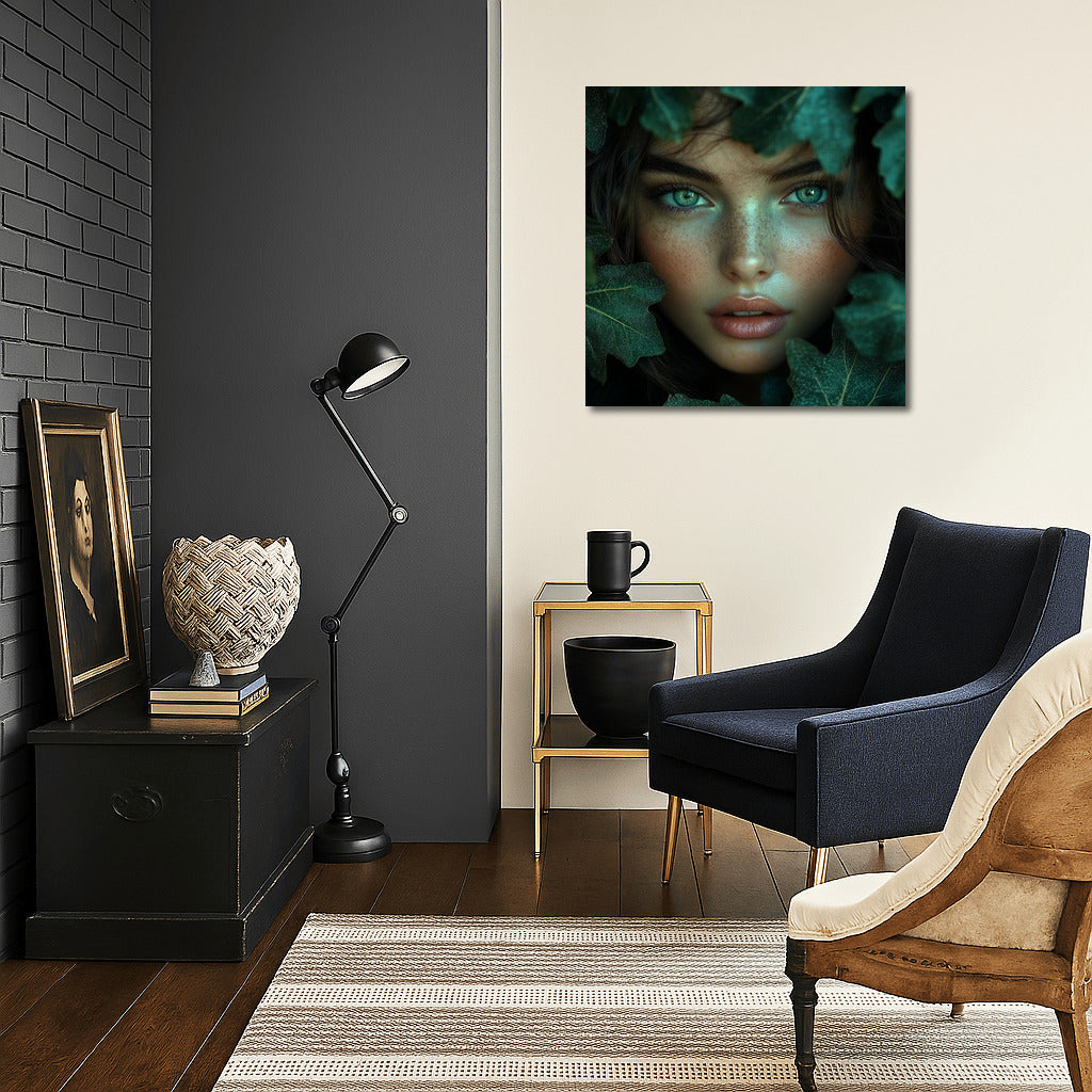 Emerald eyes and forest greenery merge in this painting, creating a magical wall art. The charm of nature in every look. See more from the collection: Wall Art with Women