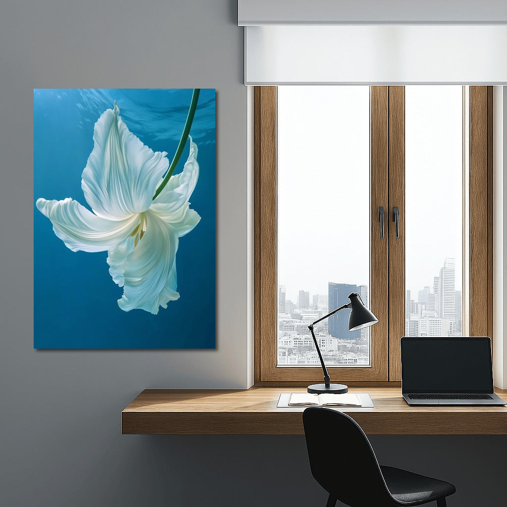 Dive into a world of subtle beauty with this painting of a flower floating in blue. Perfect wall art for inspiration. See more from the collection: Flowers Art