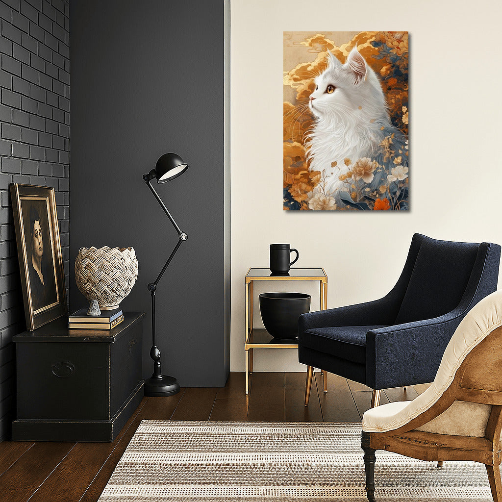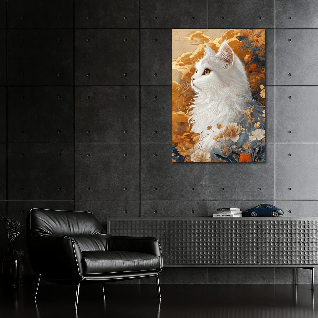 An adorable white cat among flowers and clouds in a poster style is a wall art that brings coziness to any space. See more from the collection: Animals Art