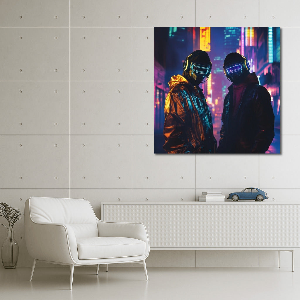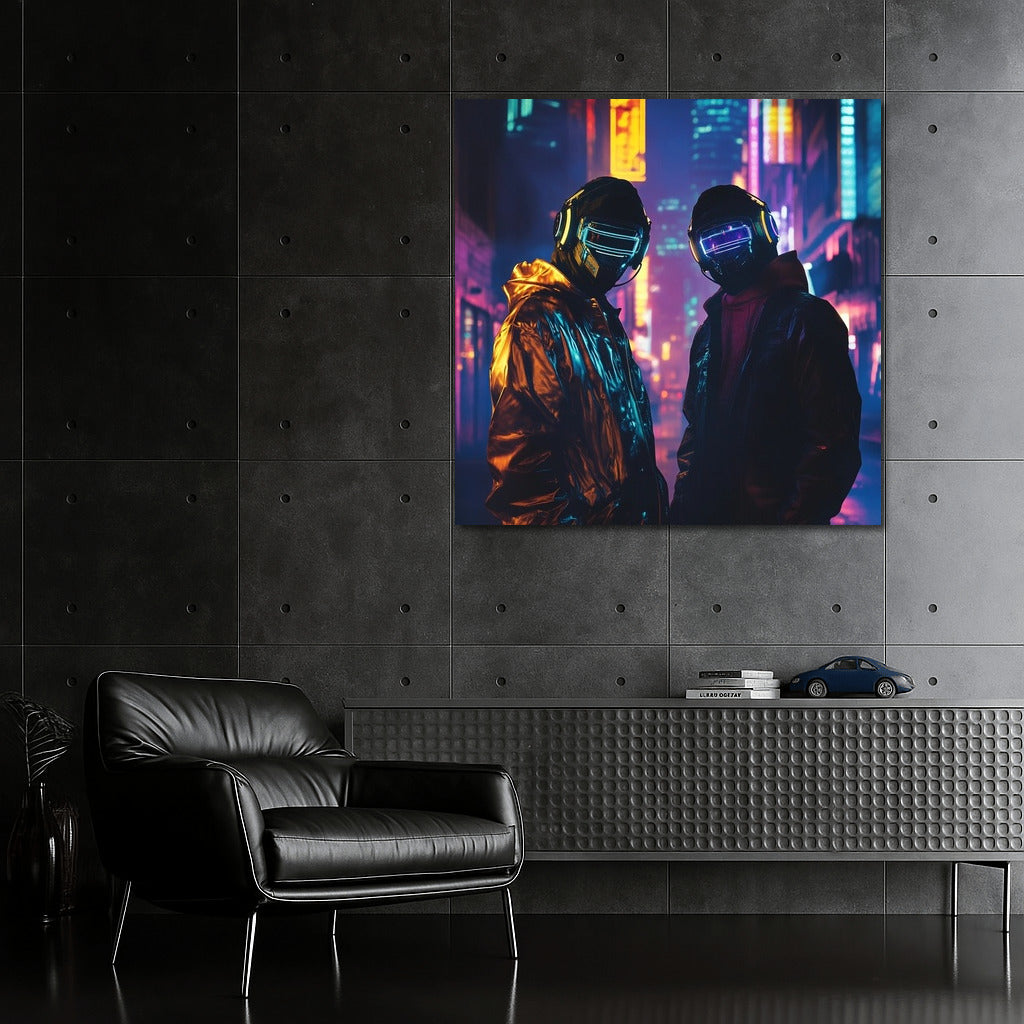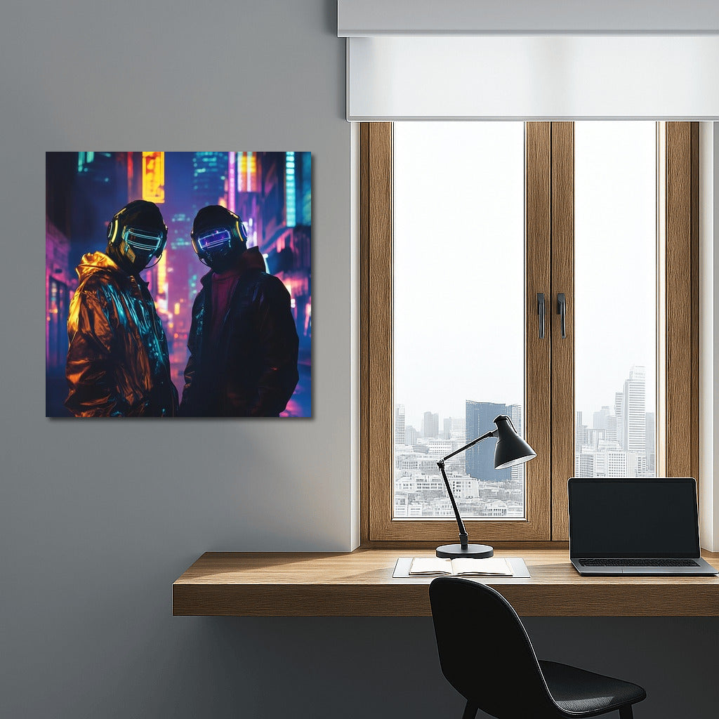 Neon city lights, mysterious helmeted figures. This poster will add a futuristic atmosphere to your space. See more from the collection: Neon Art