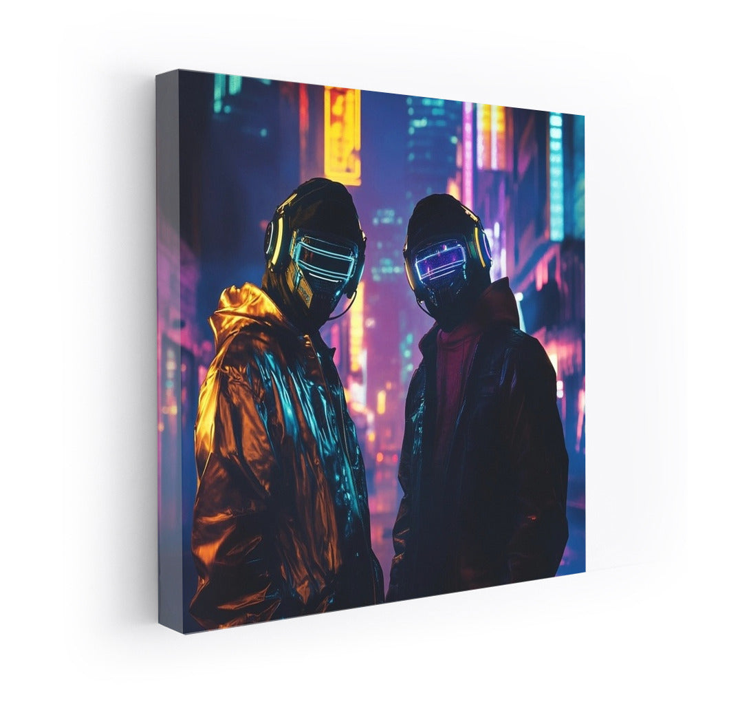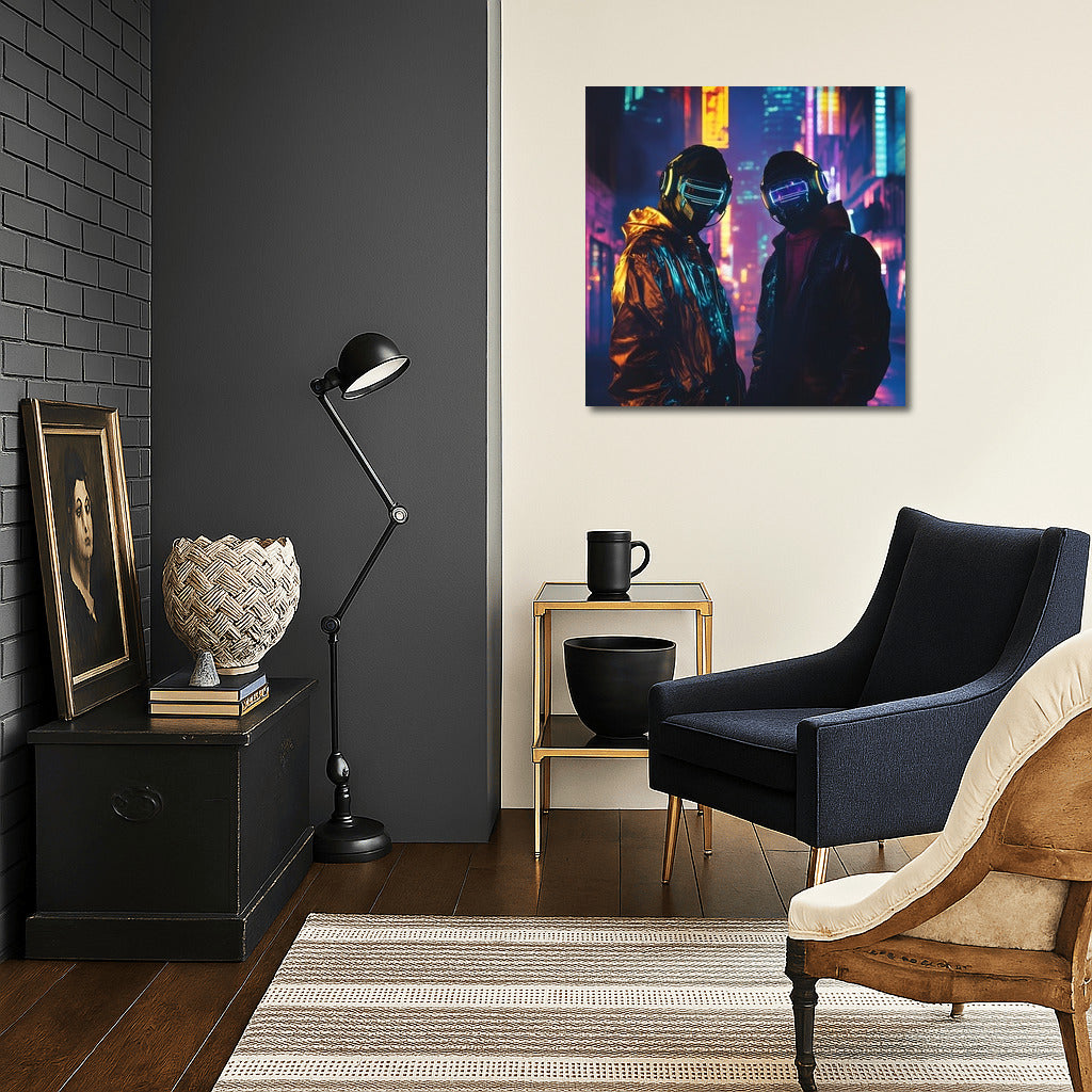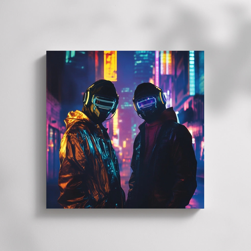 Neon city lights, mysterious helmeted figures. This poster will add a futuristic atmosphere to your space. See more from the collection: Neon Art