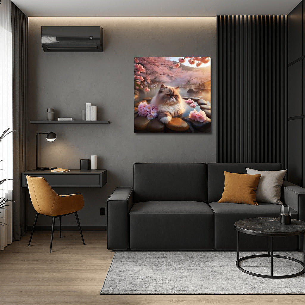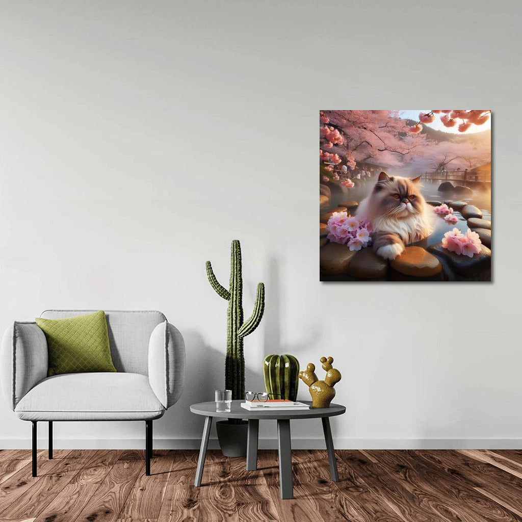Himalayan A Cat enjoys hot springs among cherry blossoms in Japan. This painting will make a unique wall art! See more from the collection: Animals Art