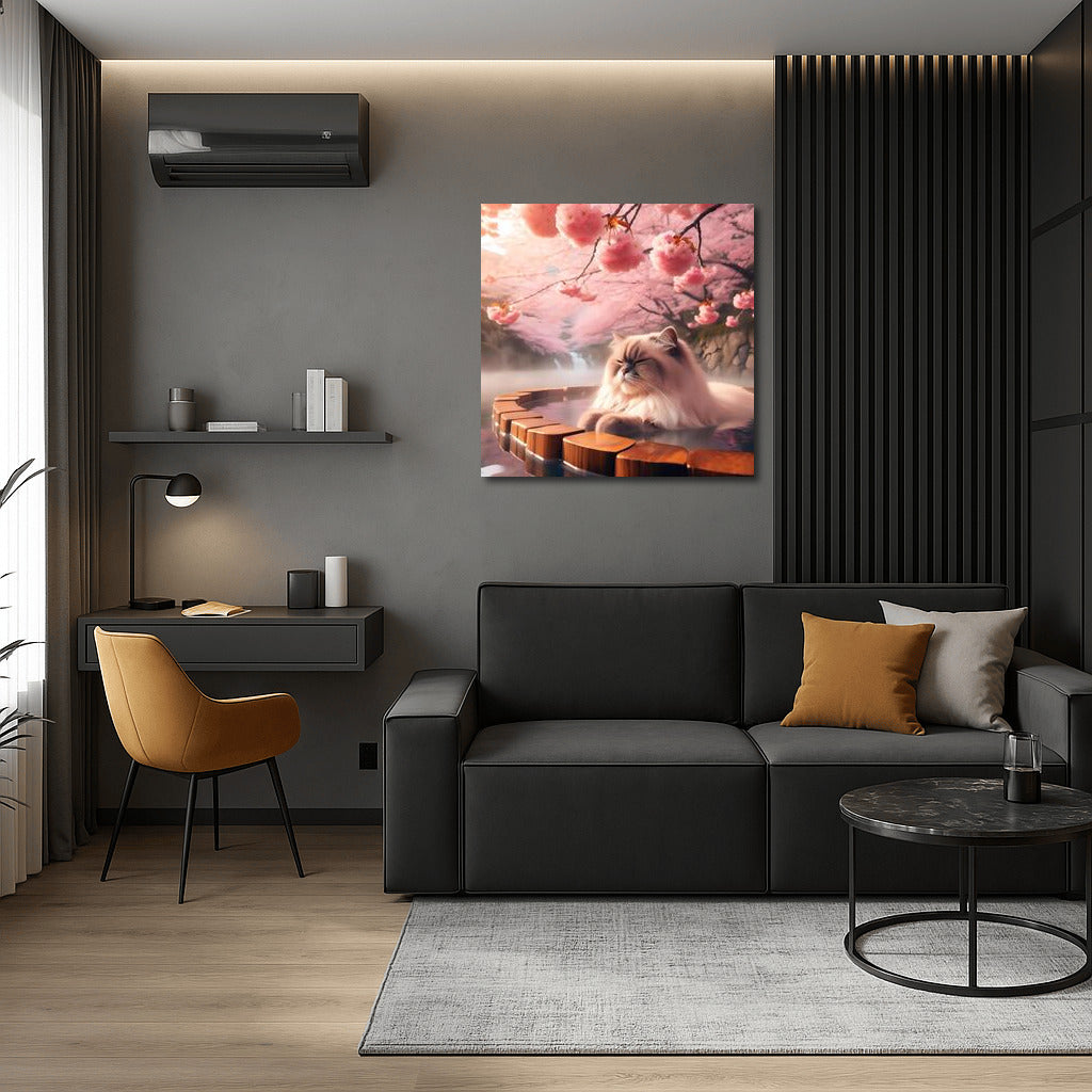 A fluffy Himalayan cat enjoys an onsen among cherry blossoms in Japan. The perfect poster for your cozy space! See more from the collection: Animals Art