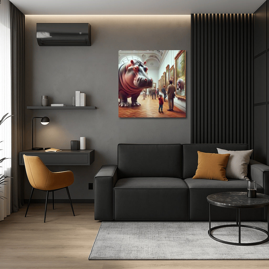 Magical poster: hippopotamus enjoying the museum exhibition. Wall art that will bring your interior to life! See more from the collection: Animals Art