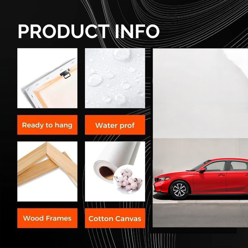 The poster features a bright 2025 Honda Civic, like a fresh shot of adrenaline against a gray wall. This is wall art for true speed lovers. The paint is shiny, the lines are sharp as a blade. This painting is a car fan's dream, the embodiment of bold style and power. See more from the collection: Honda Art