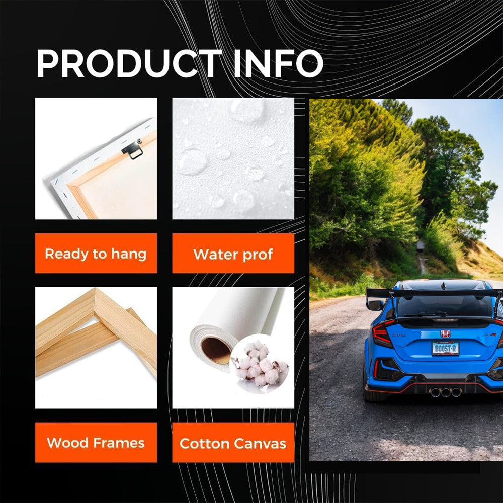 This poster is a real bomb for car lovers! The painting shows the legendary Honda Civic in blue, surrounded by nature. Wall art that will give you goosebumps, like an engine at full throttle! See more from the collection: Honda Art