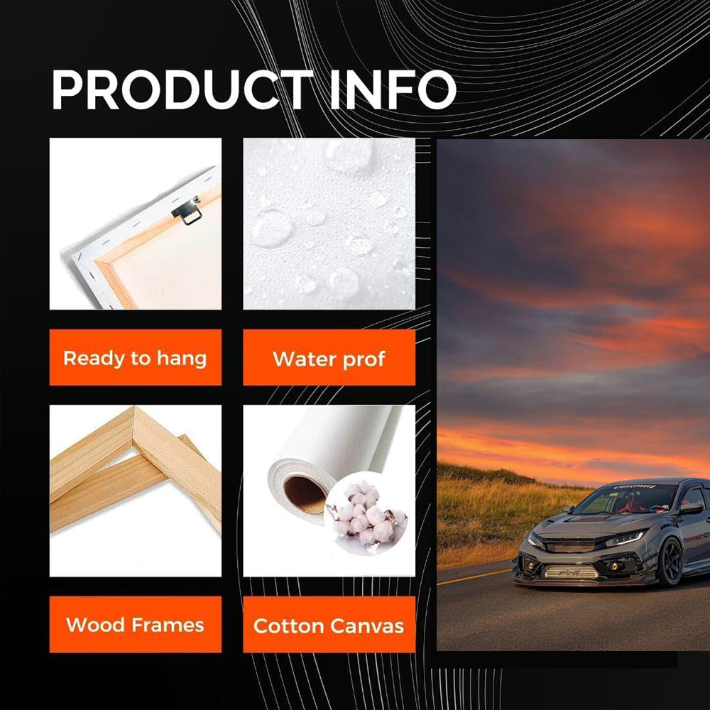 This wall art is a blast! The poster of a Honda Civic in grey, against the backdrop of a sunset, will delight any car fan. The painting seems to scream: "I am the king of the road!" The perfect choice for a masculine interior, where speed and style are appreciated. See more from the collection: Honda Art