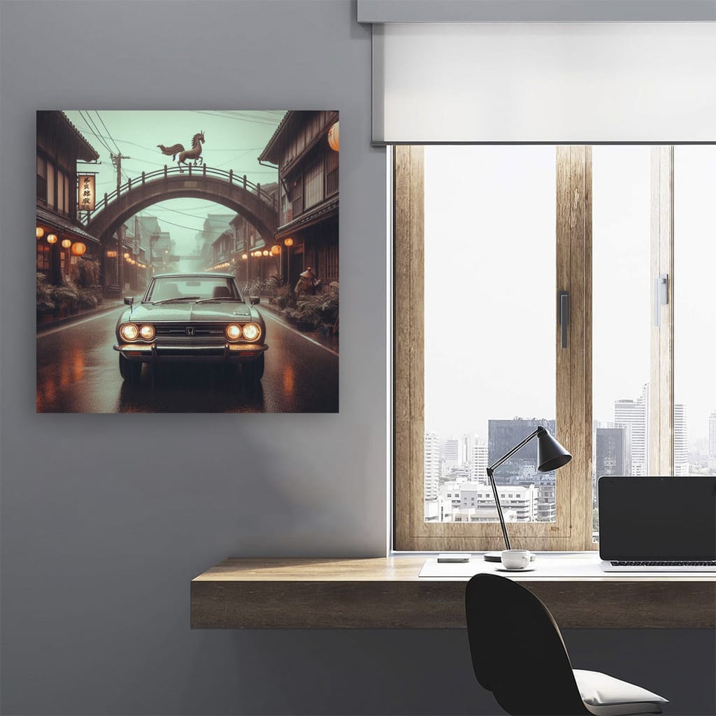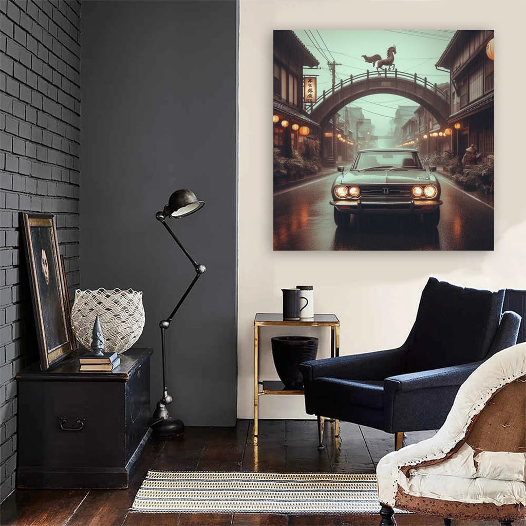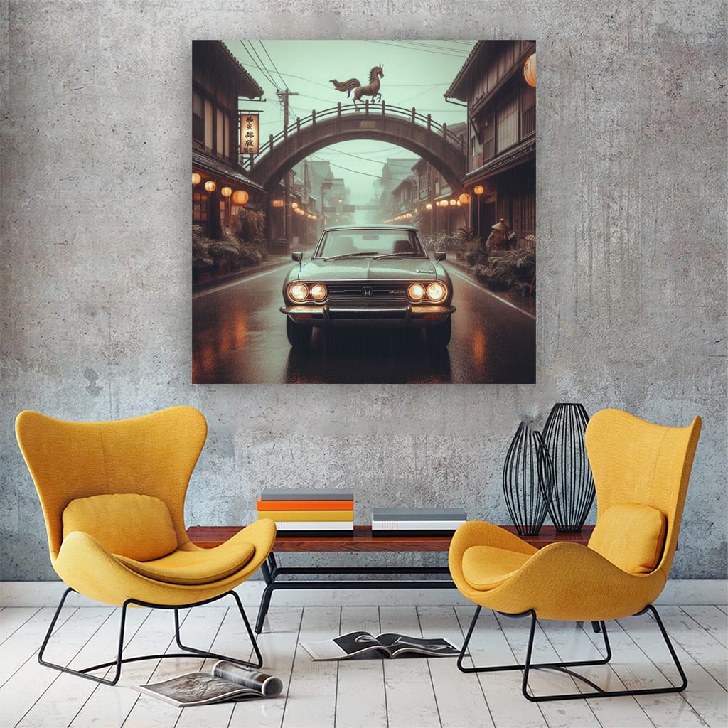 This painting is fire! The poster shows an old Honda, which is rolling on wet asphalt in the rain. Wall art for those who understand style. This retro car is a legend that you want to hang on the wall in the garage to charge the atmosphere. See more from the collection: Honda Art