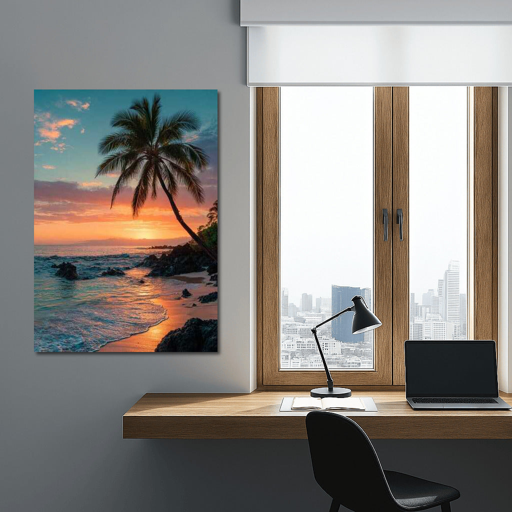 Hawaiian Sunset: The painting takes you to a dream world where waves caress the sand and the sky glows with fiery light. Wall art. See more from the collection: Cityscapes & Skylines Art
