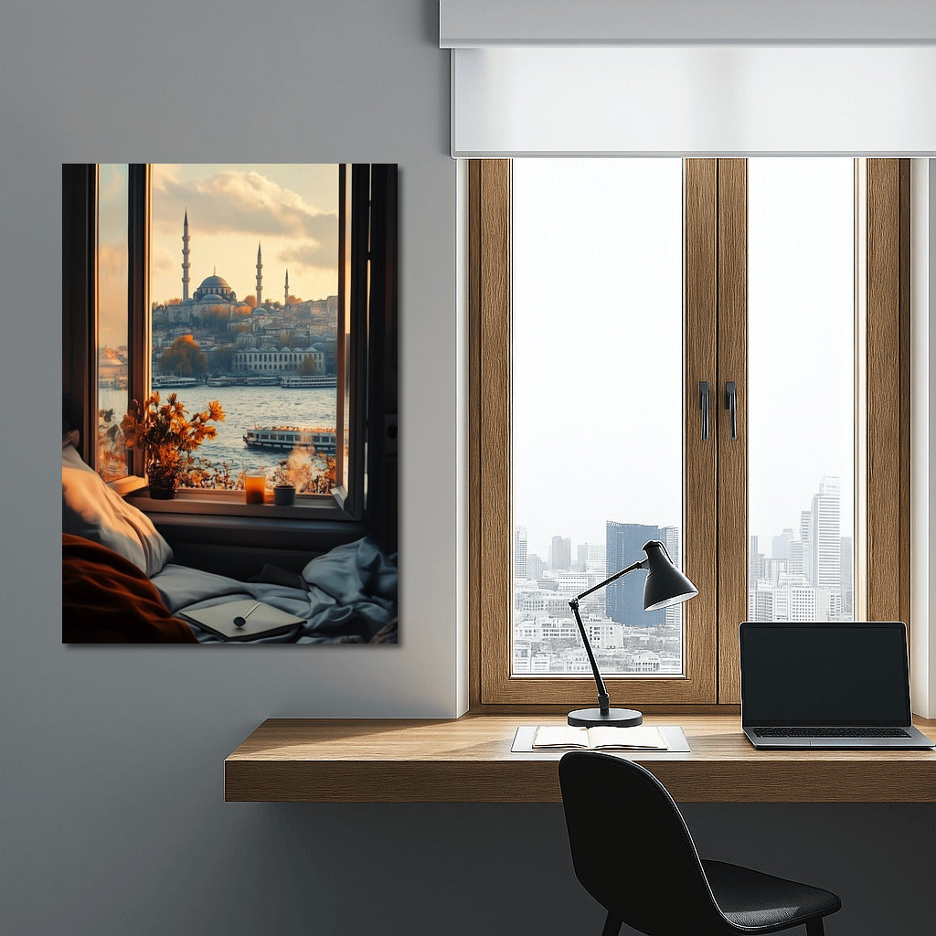 Immerse yourself in a cozy atmosphere with this poster: a warm sunset from the window and majestic city skylines enliven any space. See more from the collection: Cityscapes & Skylines Art