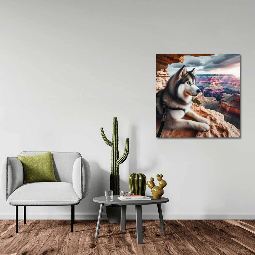 Poster of a husky enjoying the grand views of the Grand Canyon. Wall art for adventure and nature lovers. See more from the collection: Animals Art