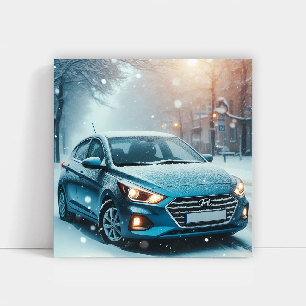This car in the painting is just fire! Hyundai Accent is captured by winter, like the hero on the poster. Wall art for real car maniacs. Ice and fire in one frame, bro. See more from the collection: Hyundai Art