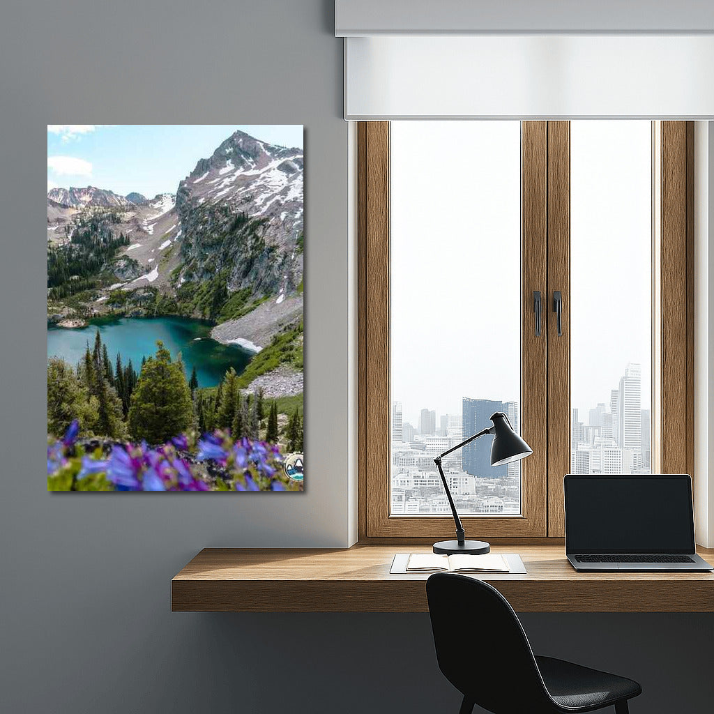 Inspirational wall art: Idaho mountain tranquility reflected in a crystal clear lake. A touch of oneness with nature. See more from the collection: Country Art