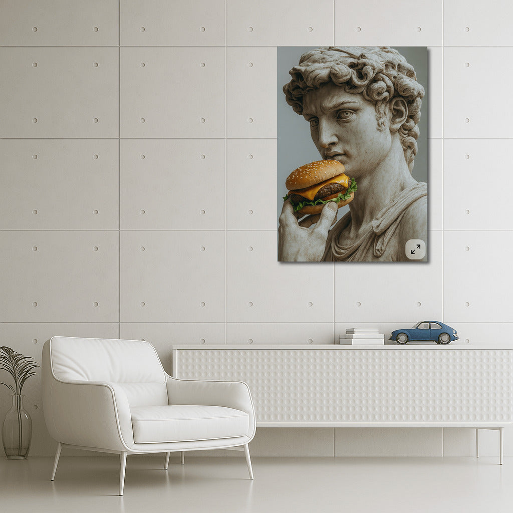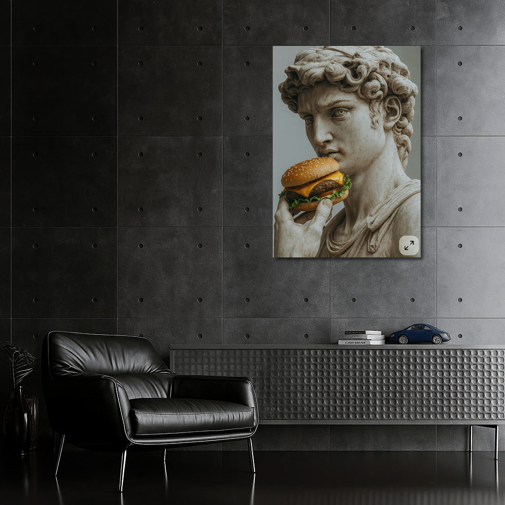 Harmony of classic and modern: a poster where the eternal taste of irony meets a delicious burger. Wall art with humor! See more from the collection: Humor Art
