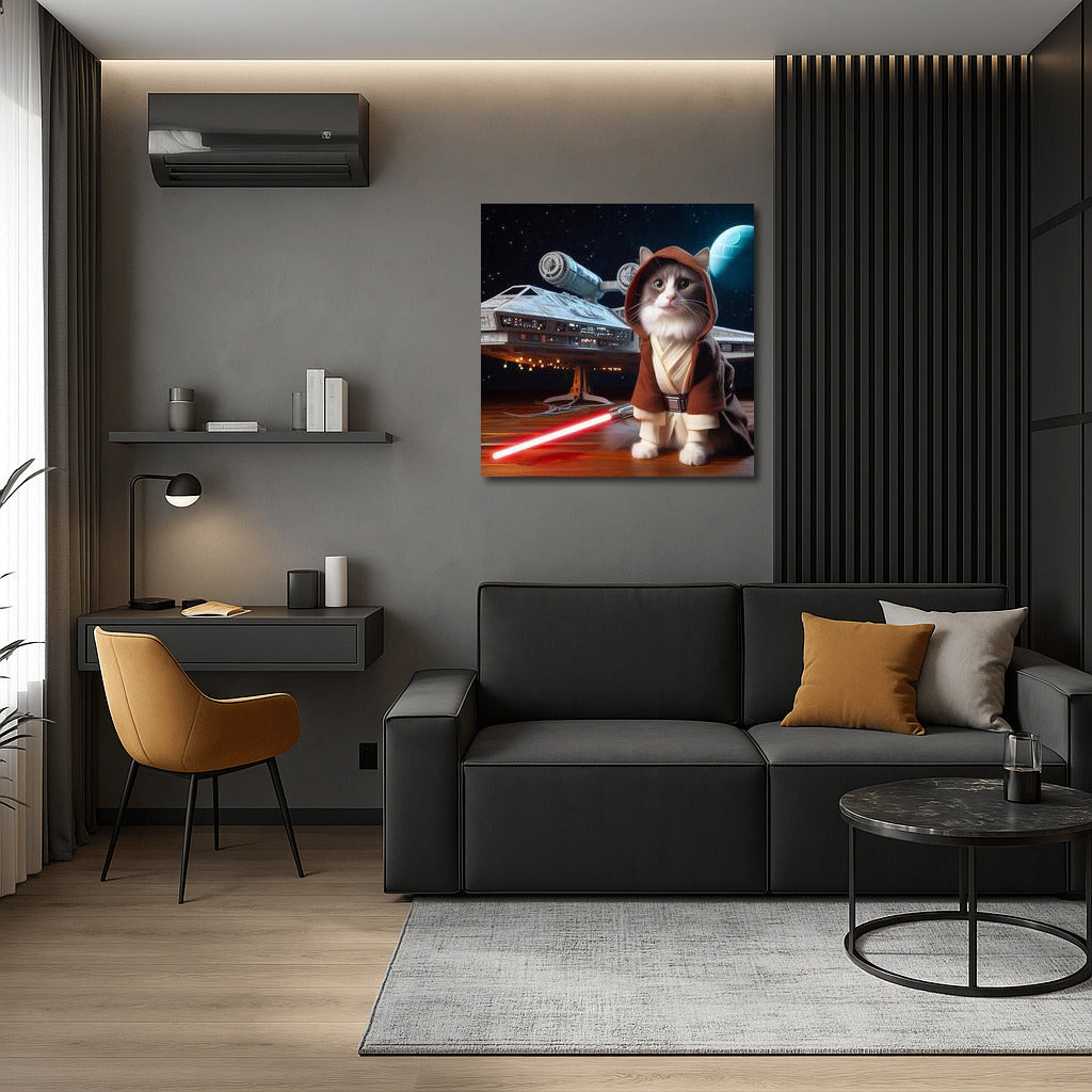 Jedi Cat with Laser Sword on Star Wars Style Spaceship Background Wall Art