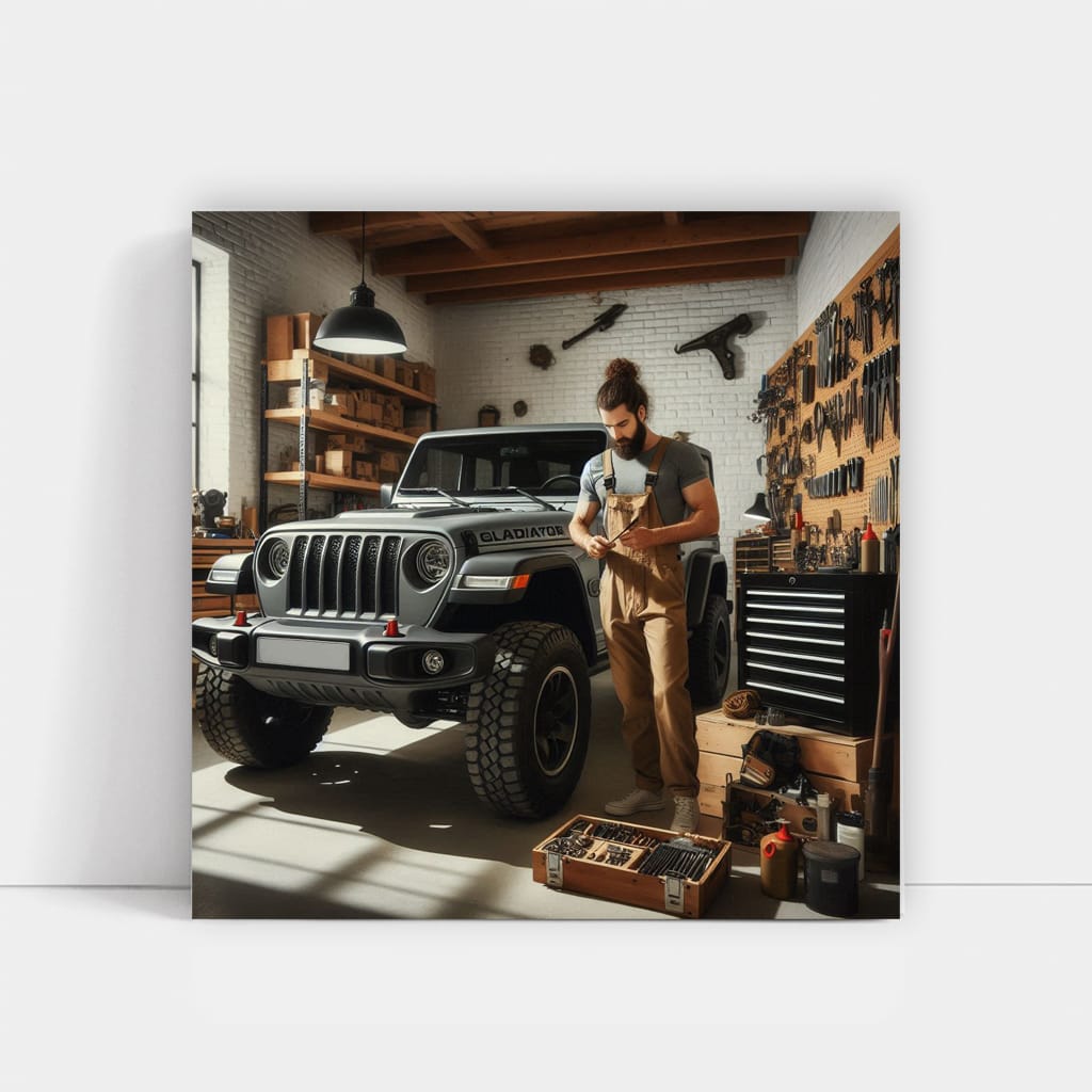 Yo, bros! Here's a poster that will blow your mind: Jeep Gladiator in the garage, a real painting for men. This wall art screams strength and freedom. Put it in your den, and you will immediately feel the roar of the engine and the smell of adventure. See more from the collection: Jeep Art