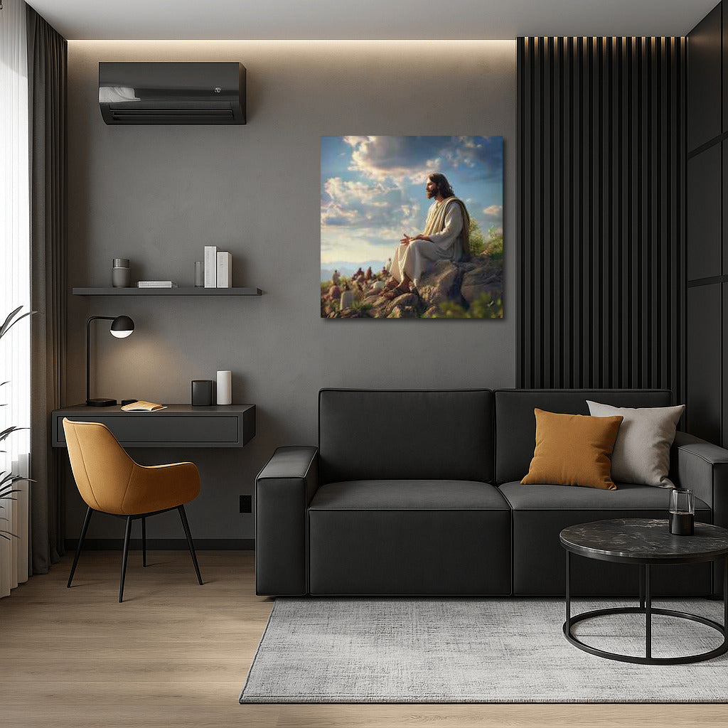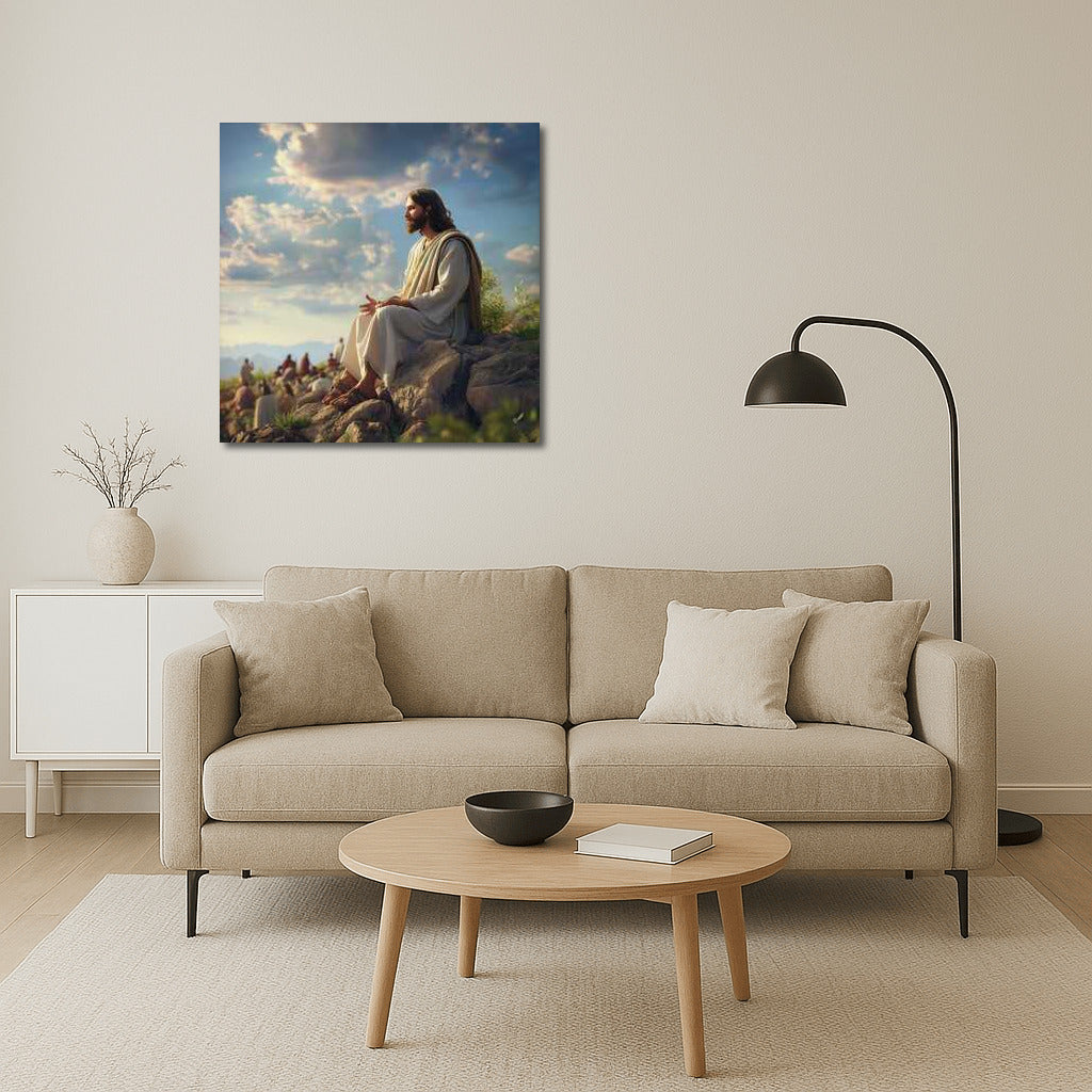 Create an atmosphere of comfort and wisdom with this poster: Jesus sits on a rock in thought, reflecting eternal truths. See more from the collection: Christianity / Jesus Art