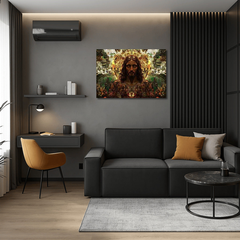Immerse yourself in a mystical garden with this painting: Jesus surrounded by golden ornaments in a moment of light and peace. Wall art. See more from the collection: Christianity / Jesus Art